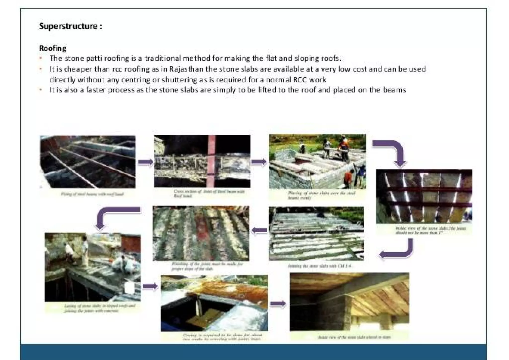 The document discusses various sustainable construction techniques and materials used in composite climate zones, focusing on thermal insulation and heat management. It highlights the benefits of local materials, innovative designs like funicular roofs, and the use of solar panels to enhance energy efficiency. Techniques such as straw thatch, bamboo, and exposed brick are emphasized for their effectiveness in minimizing heat gain and maximizing comfort.