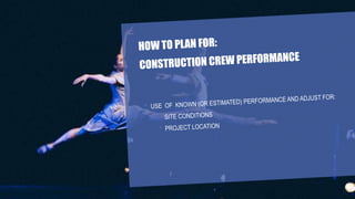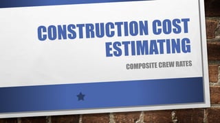 The document explains the role of construction crews in cost estimating, defining crews as groups of resources working on specific construction tasks, including labor, equipment, and tools. It discusses the composition, performance, and efficiency of crews, emphasizing the importance of experience and validation of data when planning for crew composition. Additionally, it outlines challenges in cost estimating and the value of using composite crew rates for accurate project estimation.