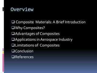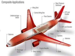 This document discusses the use of composite materials in aircraft structures. It defines composites as materials made from two or more constituent materials combined to produce improved properties. Composites provide benefits for aircraft like high strength to weight ratios, corrosion and impact resistance, and the ability to form complex shapes. Common composite constituents in aircraft are fiber reinforcements within polymer, metal, or ceramic matrices. Applications of composites in aircraft include fuselage and wing skins due to their weight savings over metal. While composites provide advantages, their production is more expensive and recycling presents challenges compared to conventional materials.