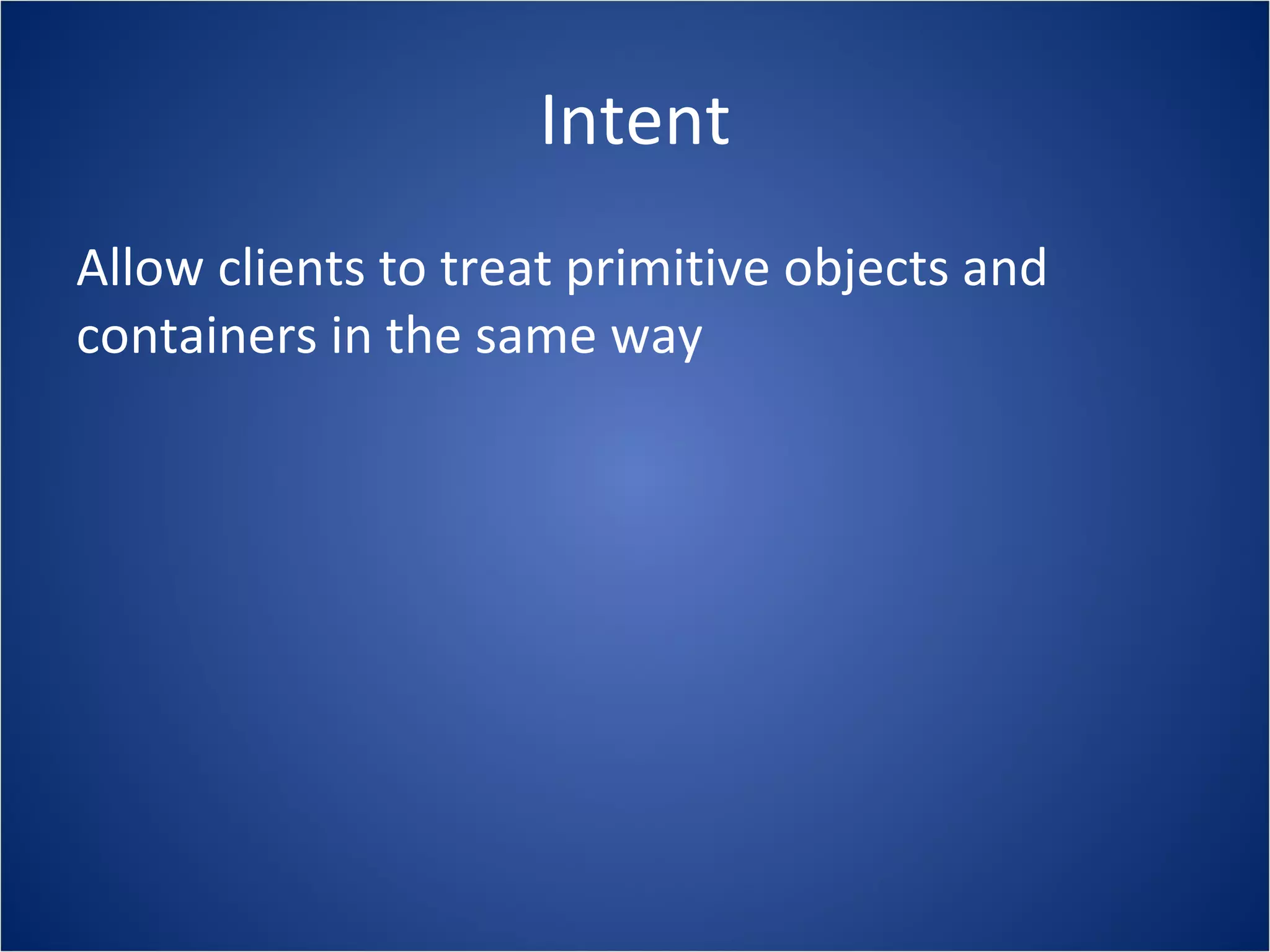 The Composite pattern allows clients to treat primitive objects and containers of objects uniformly by composing them into tree structures. It allows clients to treat individual objects and compositions of objects in a uniform manner. The pattern allows clients to recursively compose objects into tree structures to represent part-whole hierarchies.
