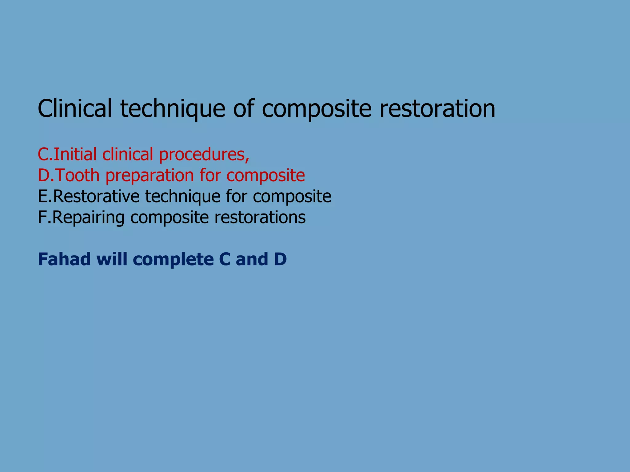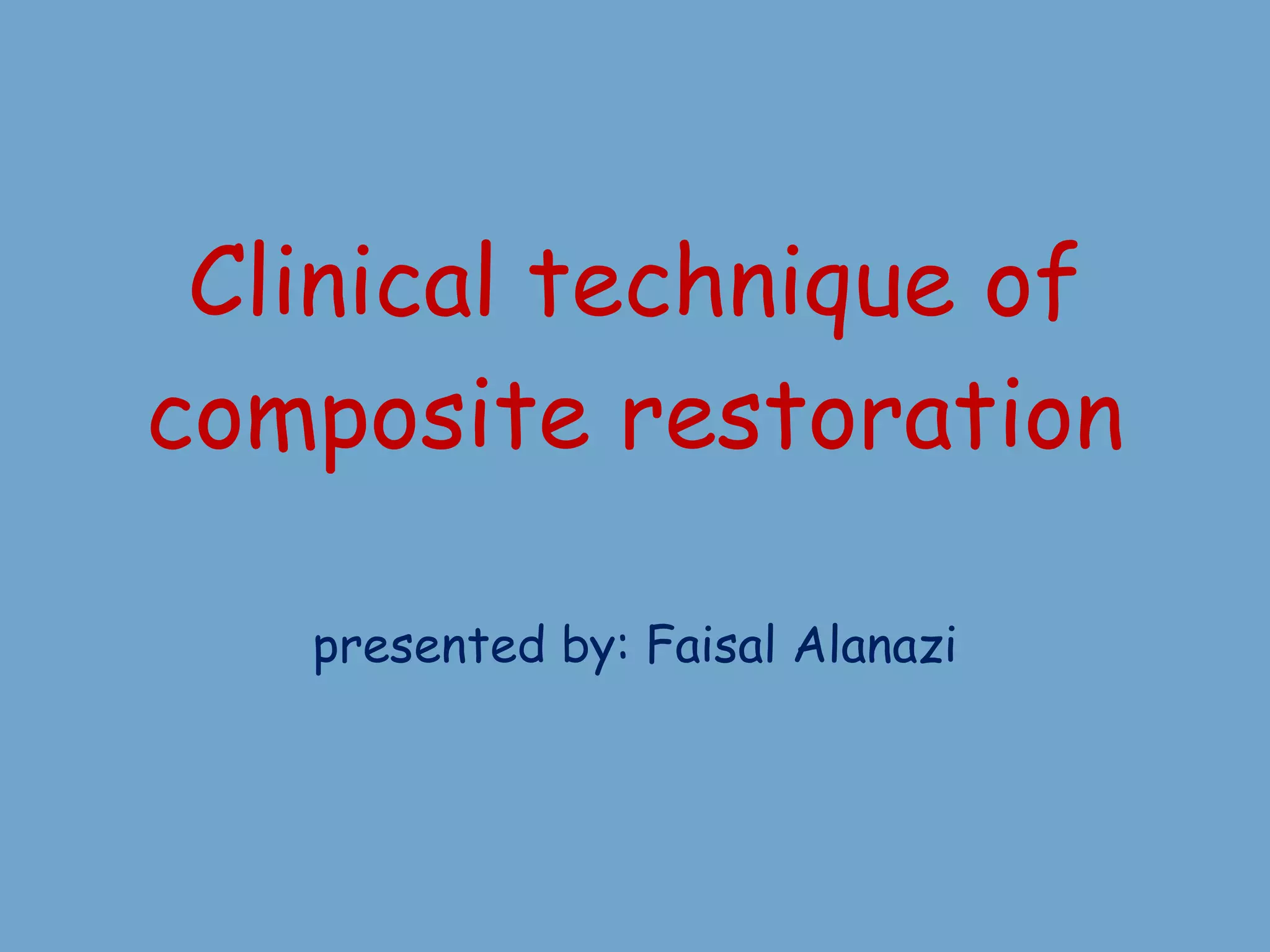 The document discusses the clinical technique for composite restoration. It covers initial procedures like local anesthesia and shade selection. It then discusses tooth preparation, including cavity designs like conventional, beveled conventional, modified box shape, and facial/lingual slot. Matrix placement and isolation of the operating site are also covered. Pulp protection and restorative techniques are briefly mentioned.