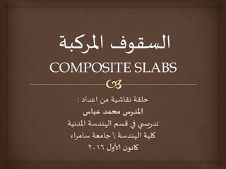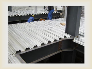 الوثيقة تناقش استخدام العناصر الخرسانية المدعومة بالفولاذ في المنشآت، مع توضيح مميزاتها وعيوبها. تشمل العناصر مثل العوارض والأعمدة والألواح، وتستعرض فوائد استخدامها في زيادة المتانة والمرونة. كما تتناول أمثلة لمشاريع معمارية بارزة استخدمت هذه المواد.