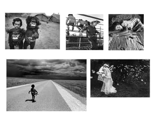 The document provides guidance on various compositional techniques for photography. It discusses capturing the moment in time, emphasizing the subject through point of view, framing, cropping, simplicity, contrast, leading lines, implied forms, angles/diagonals, balance, texture, and avoiding "aliens" or distracting elements. The goal is to use these techniques to effectively communicate the theme or message of the photograph in as few elements as possible through intentional composition choices.