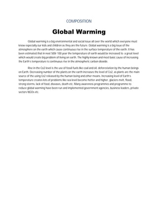 Global warming is a major environmental issue affecting the world's atmosphere and causing the steady rise in the Earth's surface temperature, according to estimates the temperature could increase significantly in the next 100-500 years causing living problems. The primary cause of increasing Earth's temperature is the continuous rise of carbon dioxide in the atmosphere from human activities like burning fossil fuels and deforestation, which decreases plants that absorb carbon dioxide. Rising temperatures create issues like higher sea levels, melting glaciers, floods, stronger storms, food shortages, diseases and deaths. Various awareness programs and efforts to reduce global warming have been implemented by government, business, and non-governmental organizations.