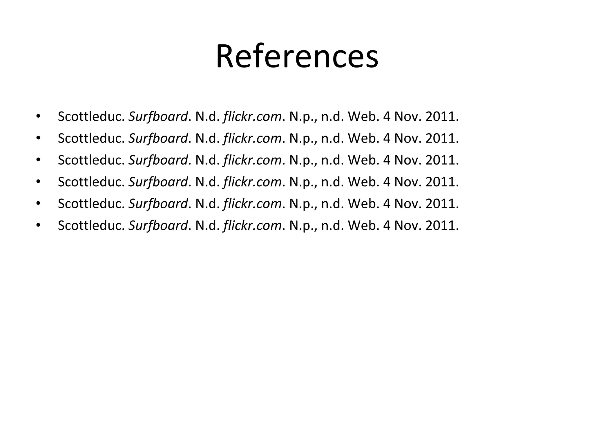 The document references a Flickr image of a surfboard posted by Scottleduc without any date or page information listed multiple times. In 3 sentences or less: The document repeatedly cites an undated Flickr image of a surfboard uploaded by Scottleduc without providing specific dates or webpage details for the reference.