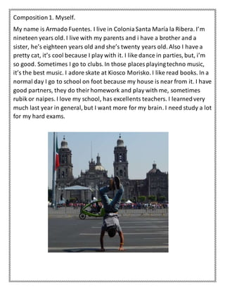 Armando Fuentes describes going to a restaurant with his family during the Feria de San Marcos in Aguascalientes, Mexico. They went to Merendero San Marcos and everyone ordered drinks - his father and he had beers while his brother drank Coca Cola. His mother ordered potatoes with oil. They had fun talking and watching people walk along the boulevard while enjoying snacks. Armando comments that he loves visiting Aguascalientes for its variety of tasty foods like burritos, tacos, birria, barbacoa, ice cream, and other desserts.