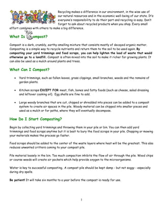 The document provides information about home composting, including what materials can be composted, how to build and maintain a compost pile or bin, and the benefits of composting. Key points include: