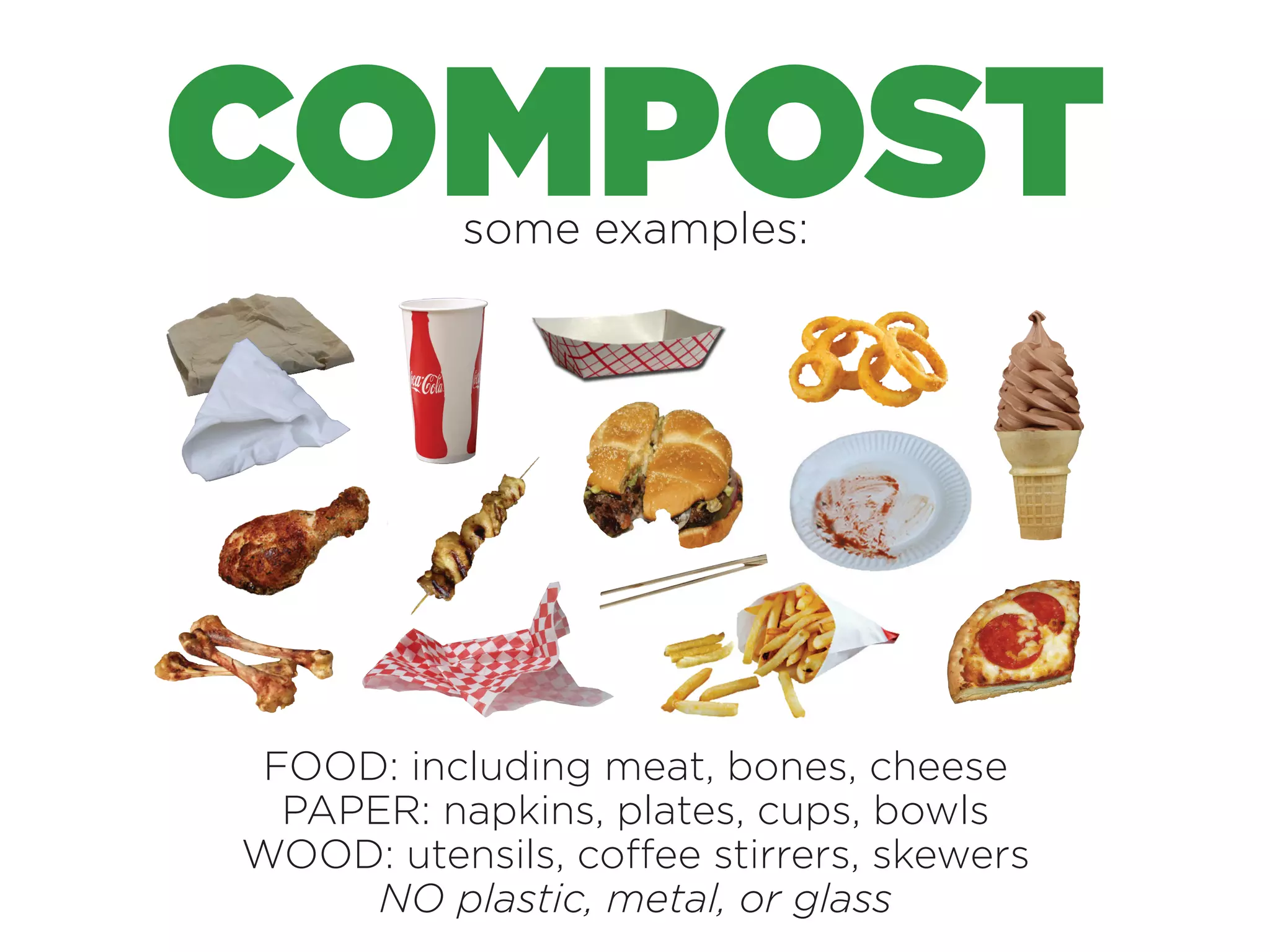 Compost can include food waste like meat, bones, and cheese as well as paper products like napkins, plates, cups and bowls. Wood items that can be composted are utensils, coffee stirrers and skewers. Plastic, metal and glass should not be included in compost.