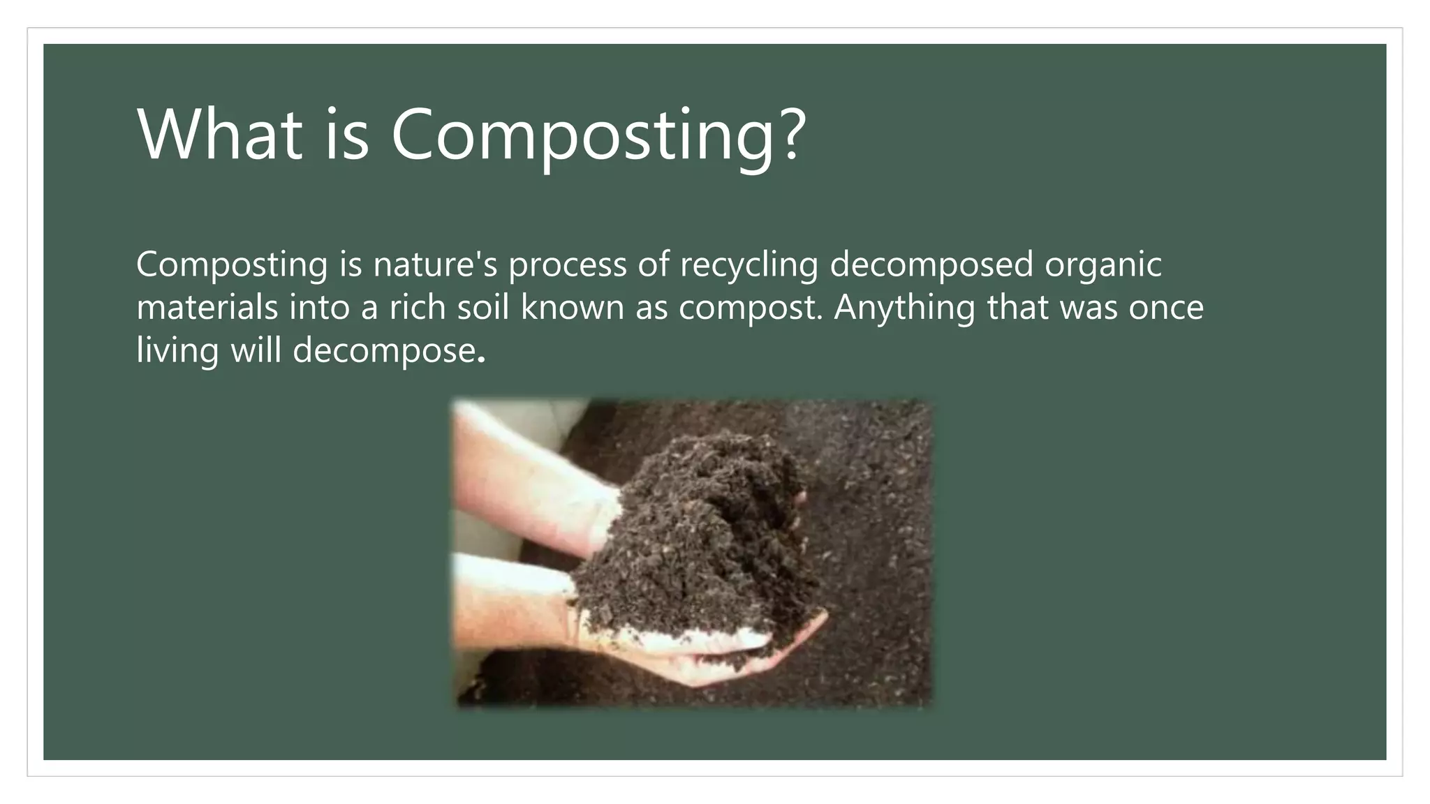 Composting is the natural process of decomposing organic materials into a nutrient-rich soil called compost. To make compost, gather kitchen and garden waste and place it in a container with holes for airflow. Layer the materials, keeping the mixture moist but not wet. After 25 days of regular mixing, earthworms will be present and turning the waste into fertilizer. Fully decomposed compost will be ready in 60-70 days to use in gardens.