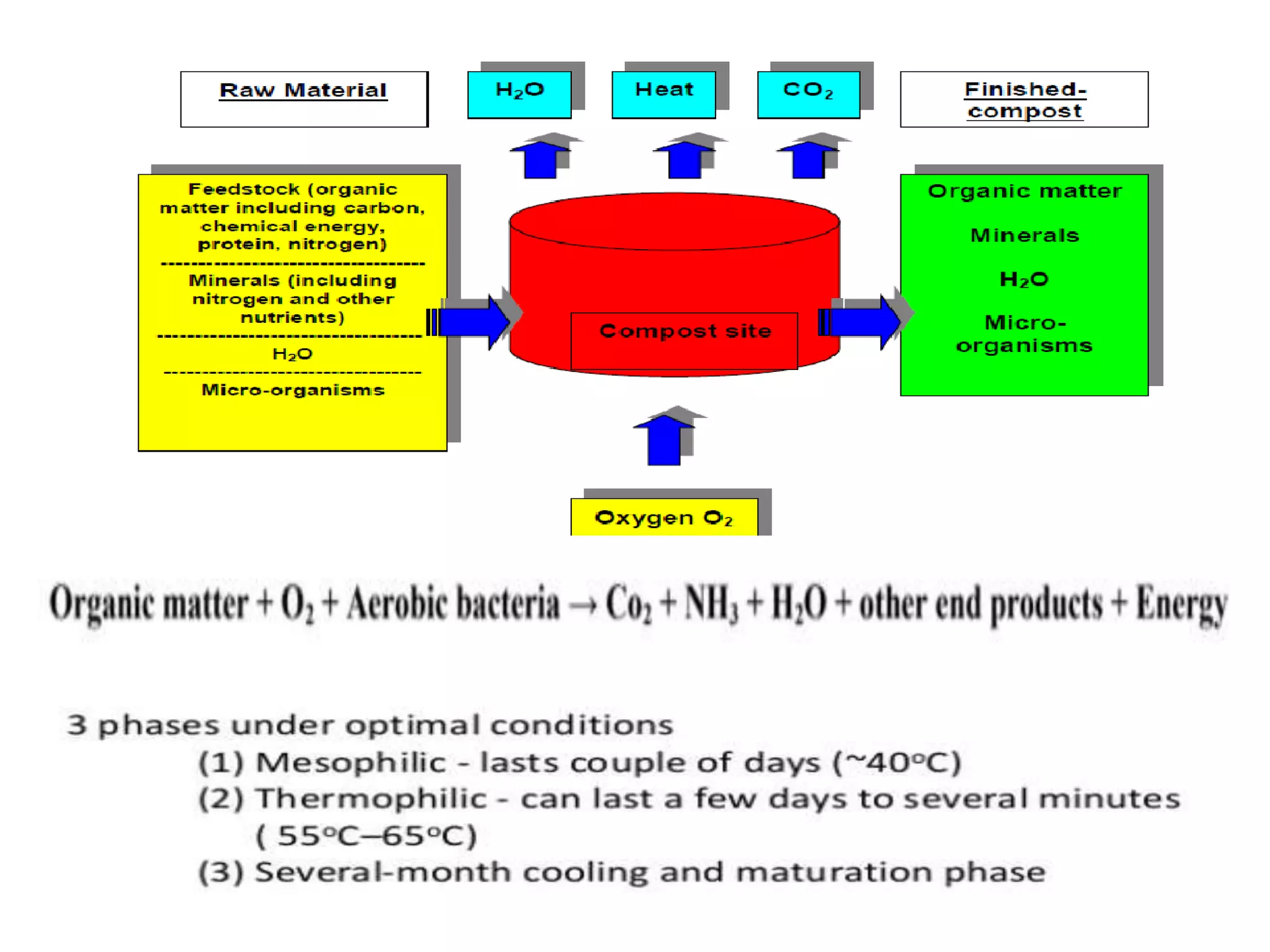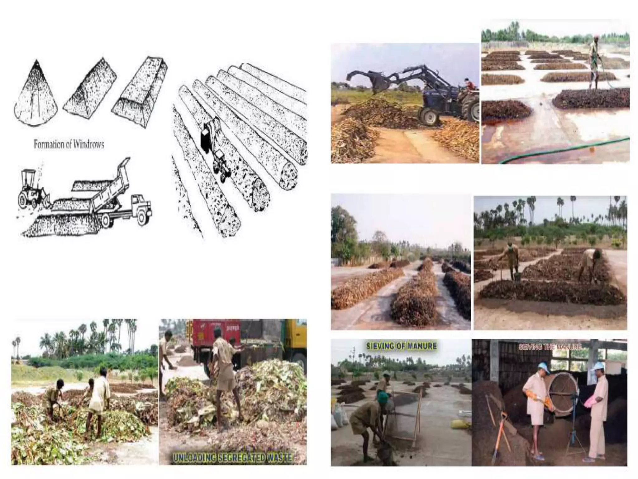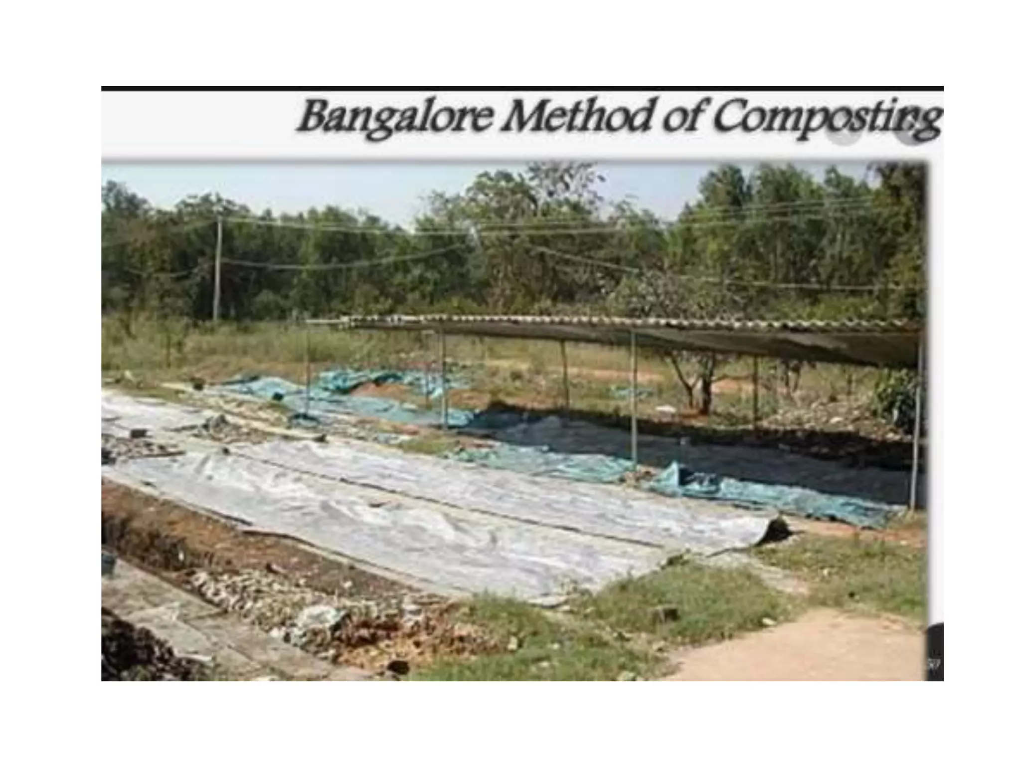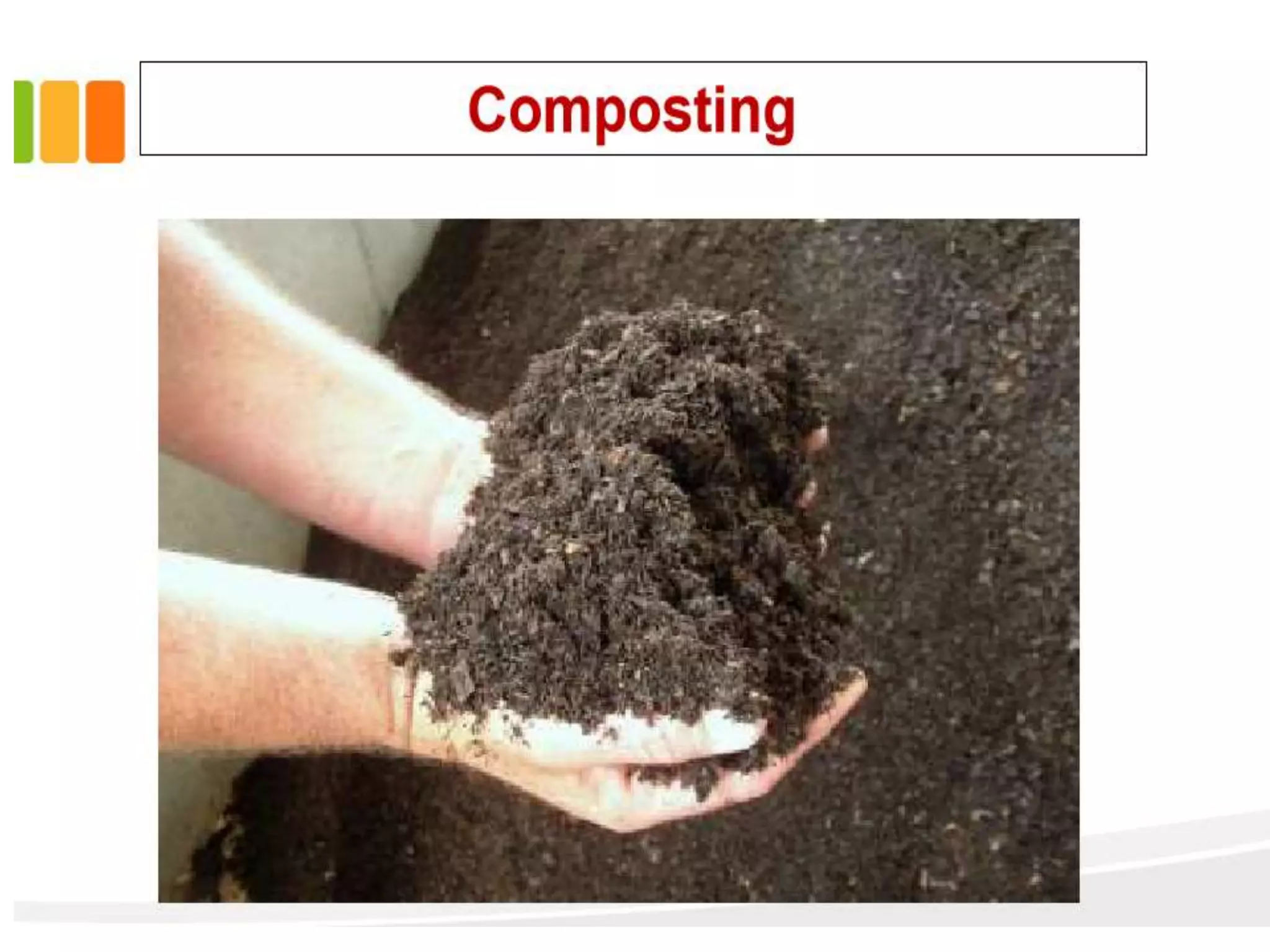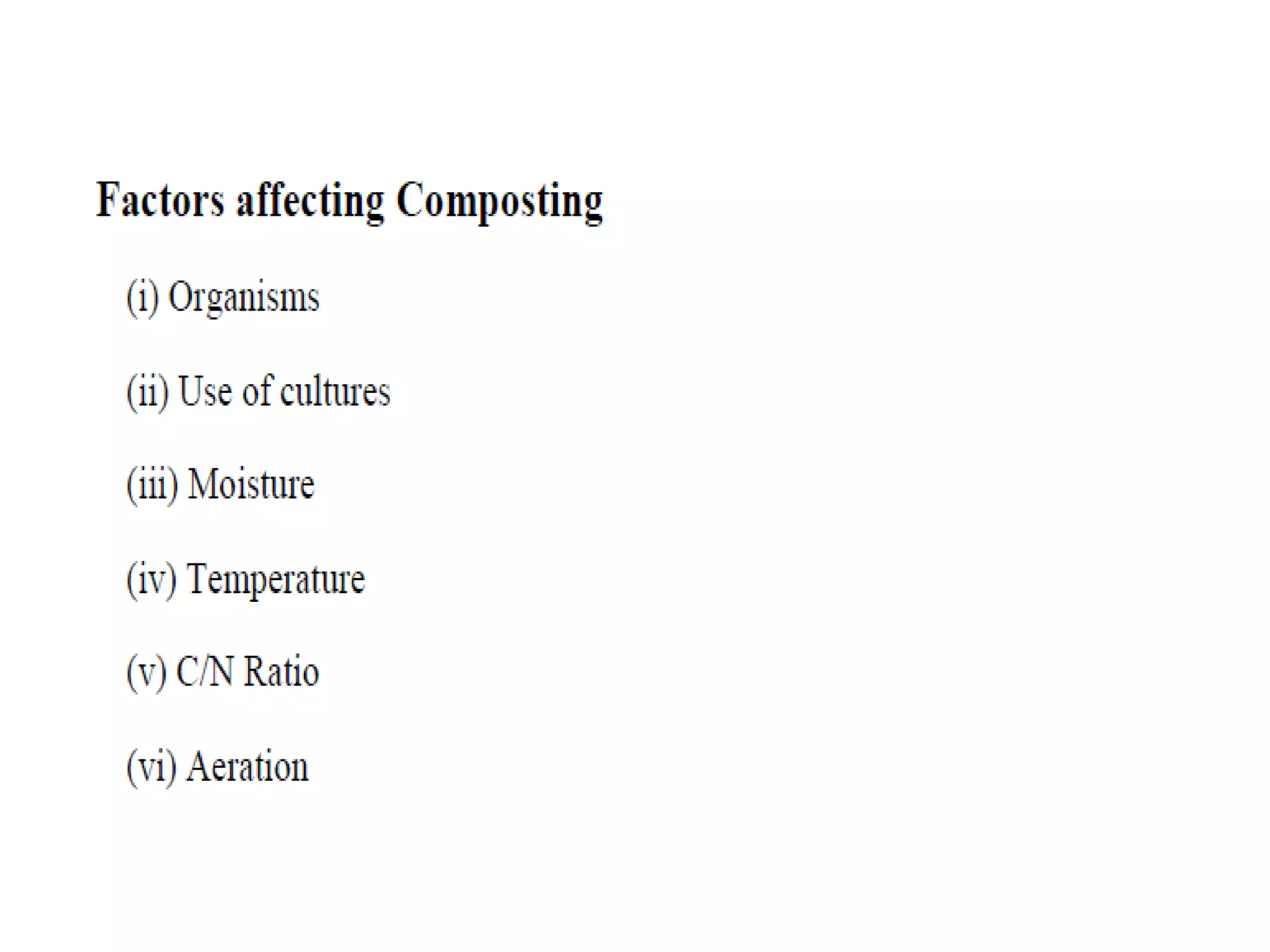 This document discusses different types of composting processes and factors that affect composting. It describes aerobic composting, which uses air and breaks down organic waste quickly without smell, and anaerobic composting, which does not use air and breaks down waste slowly with an unpleasant smell. It outlines organisms, moisture levels, temperatures, carbon to nitrogen ratios, and aeration involved in effective composting. Optimum conditions for composting include a moisture level of 50-60%, temperatures of 50-60 degrees Celsius, a carbon to nitrogen ratio of 30:1, and adequate aeration.