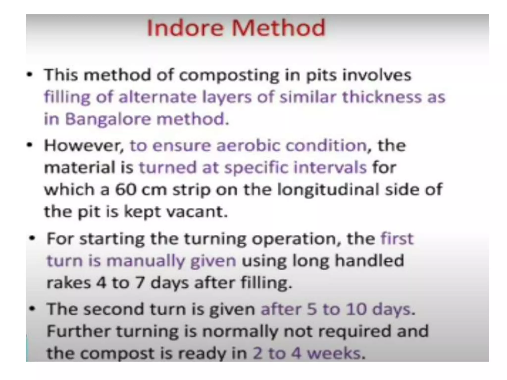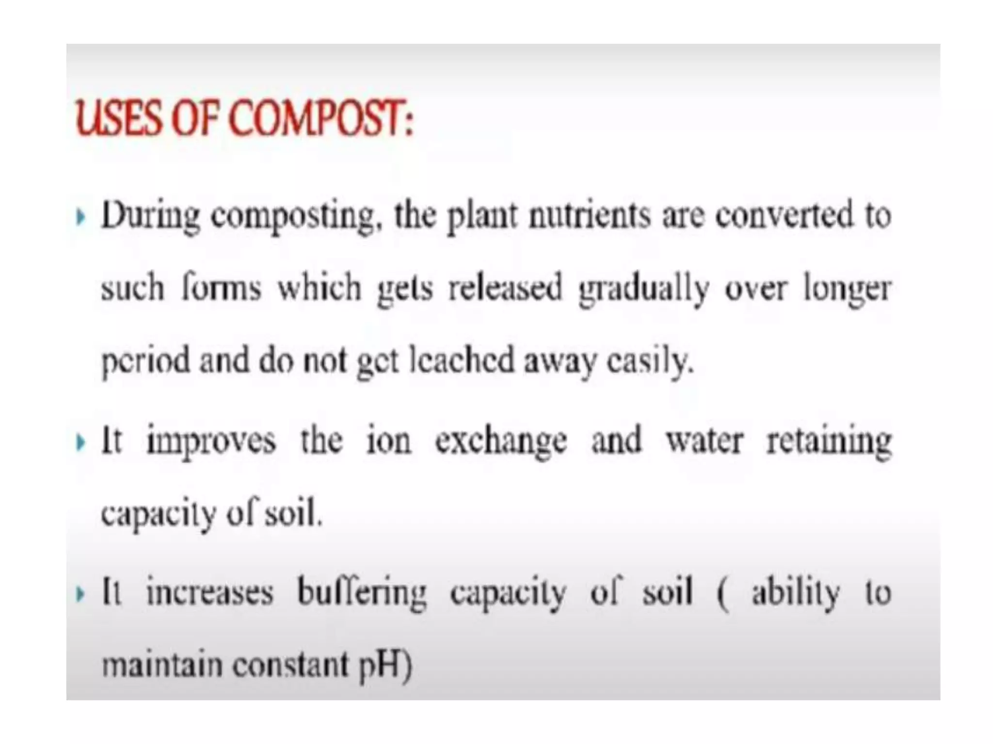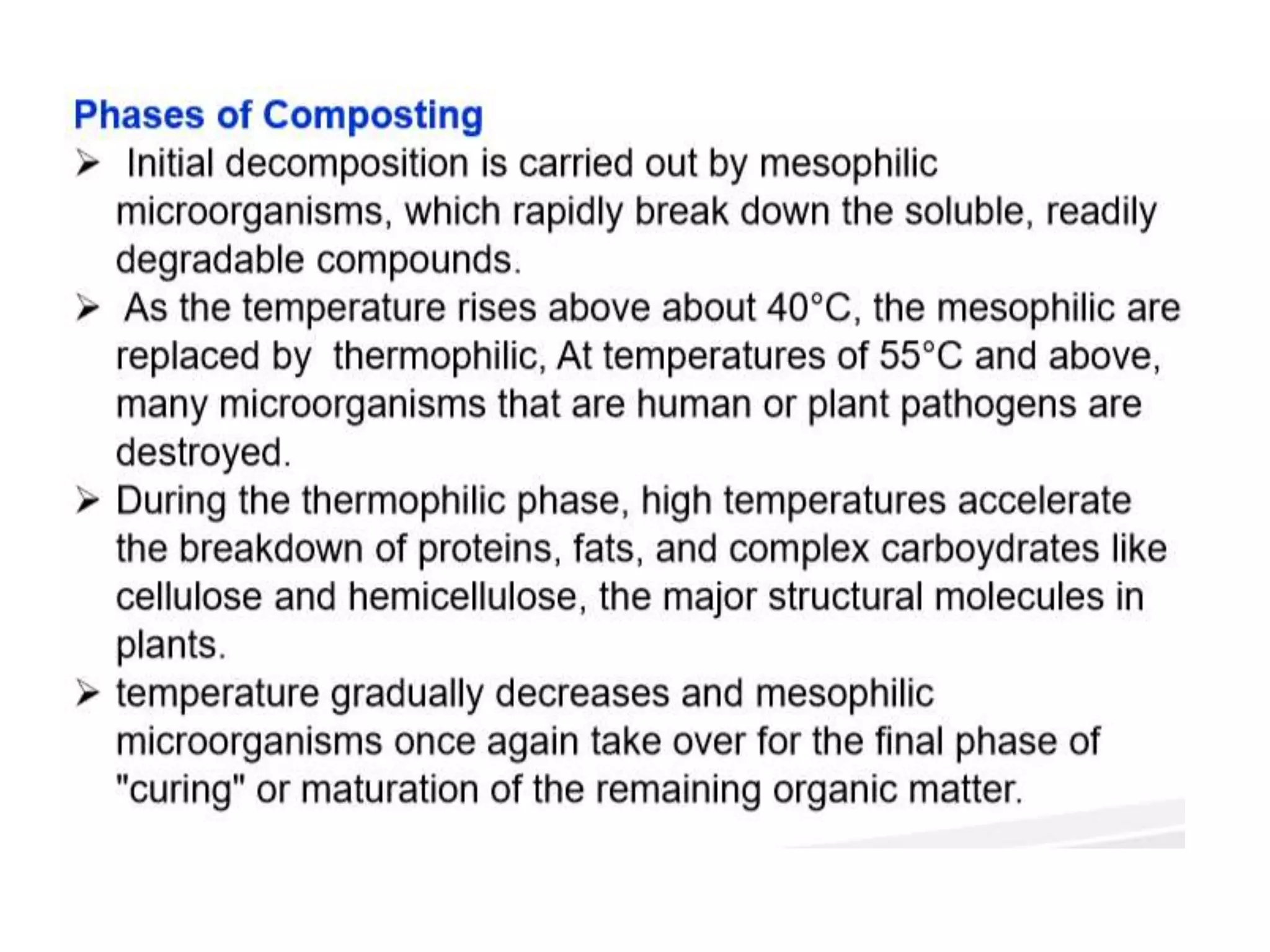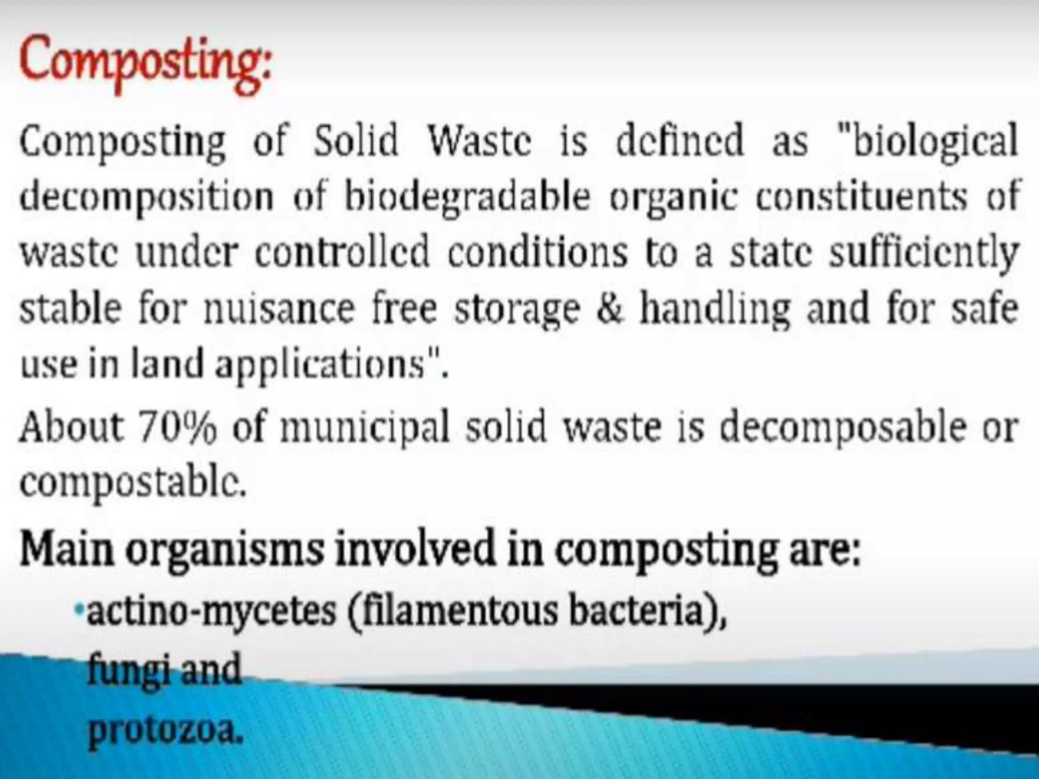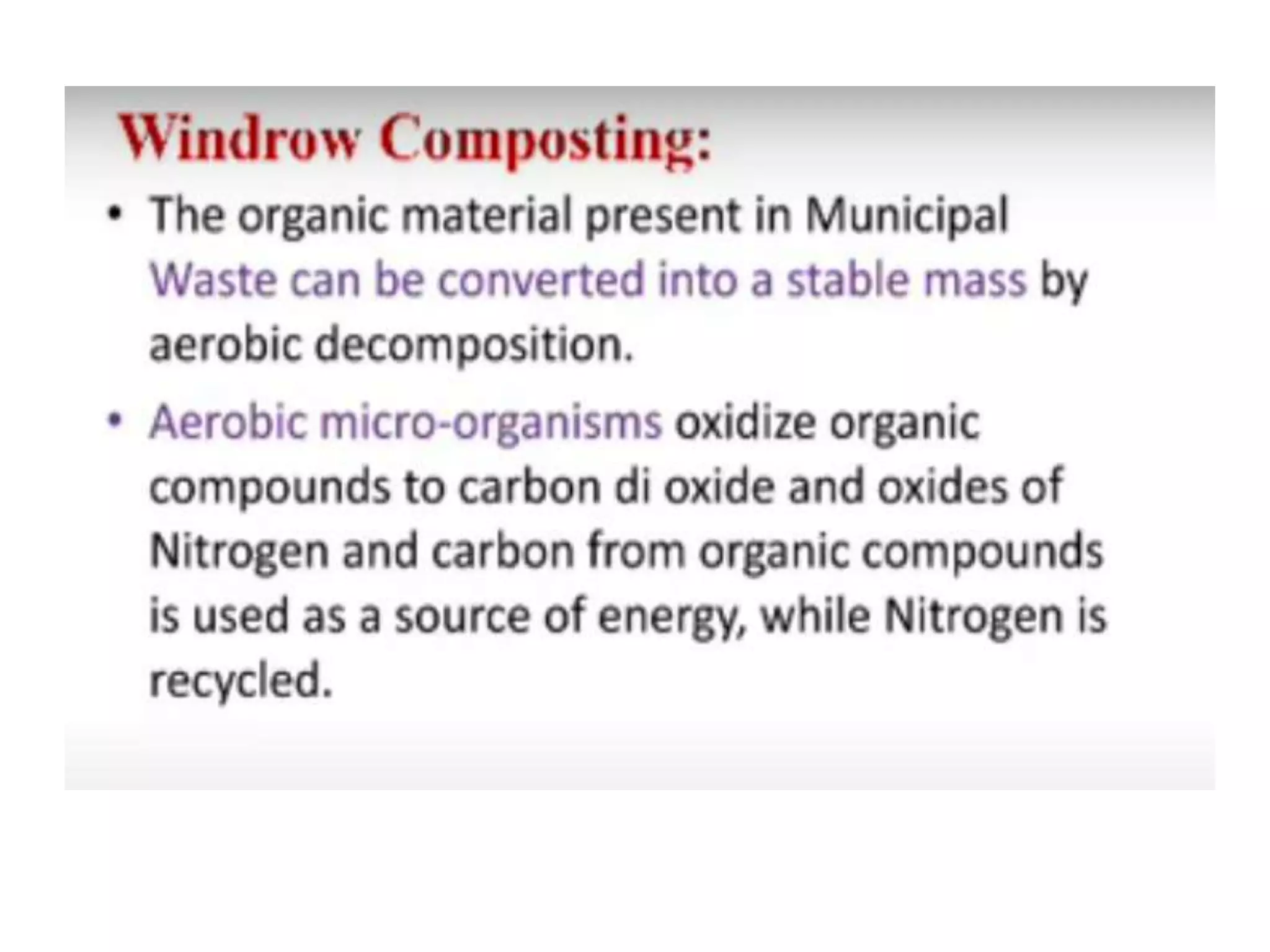 This document discusses different types of composting processes and factors that affect composting. It describes aerobic composting, which uses air and breaks down organic waste quickly without smell, and anaerobic composting, which does not use air and breaks down waste slowly with an unpleasant smell. It outlines organisms, moisture levels, temperatures, carbon to nitrogen ratios, and aeration involved in effective composting. Optimum conditions for composting include a moisture level of 50-60%, temperatures of 50-60 degrees Celsius, a carbon to nitrogen ratio of 30:1, and adequate aeration.