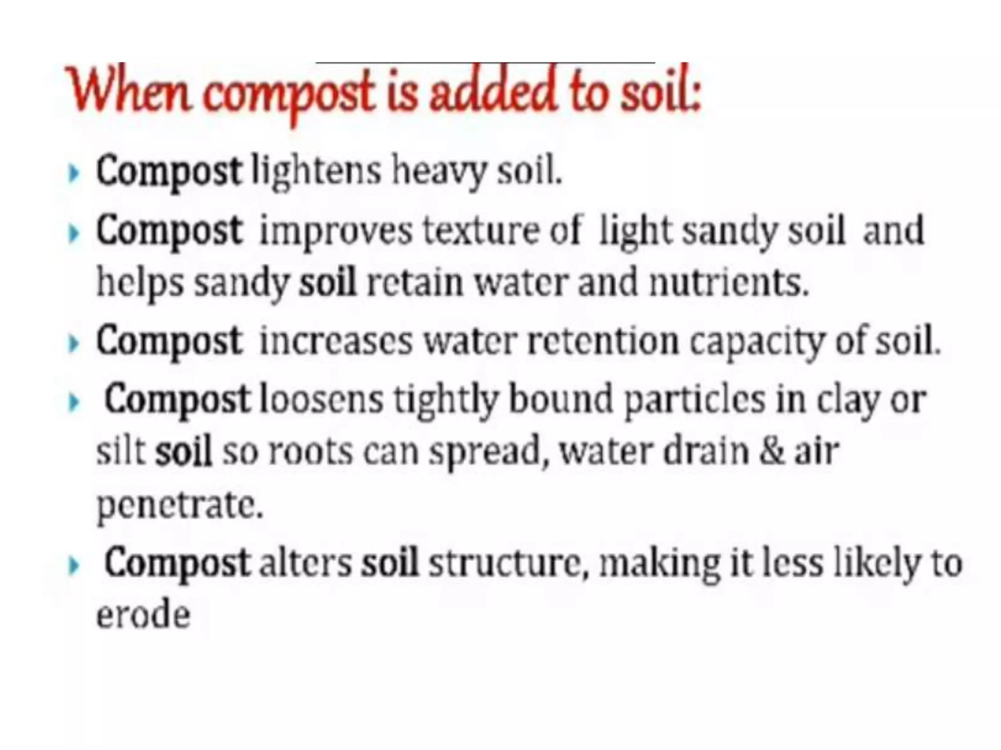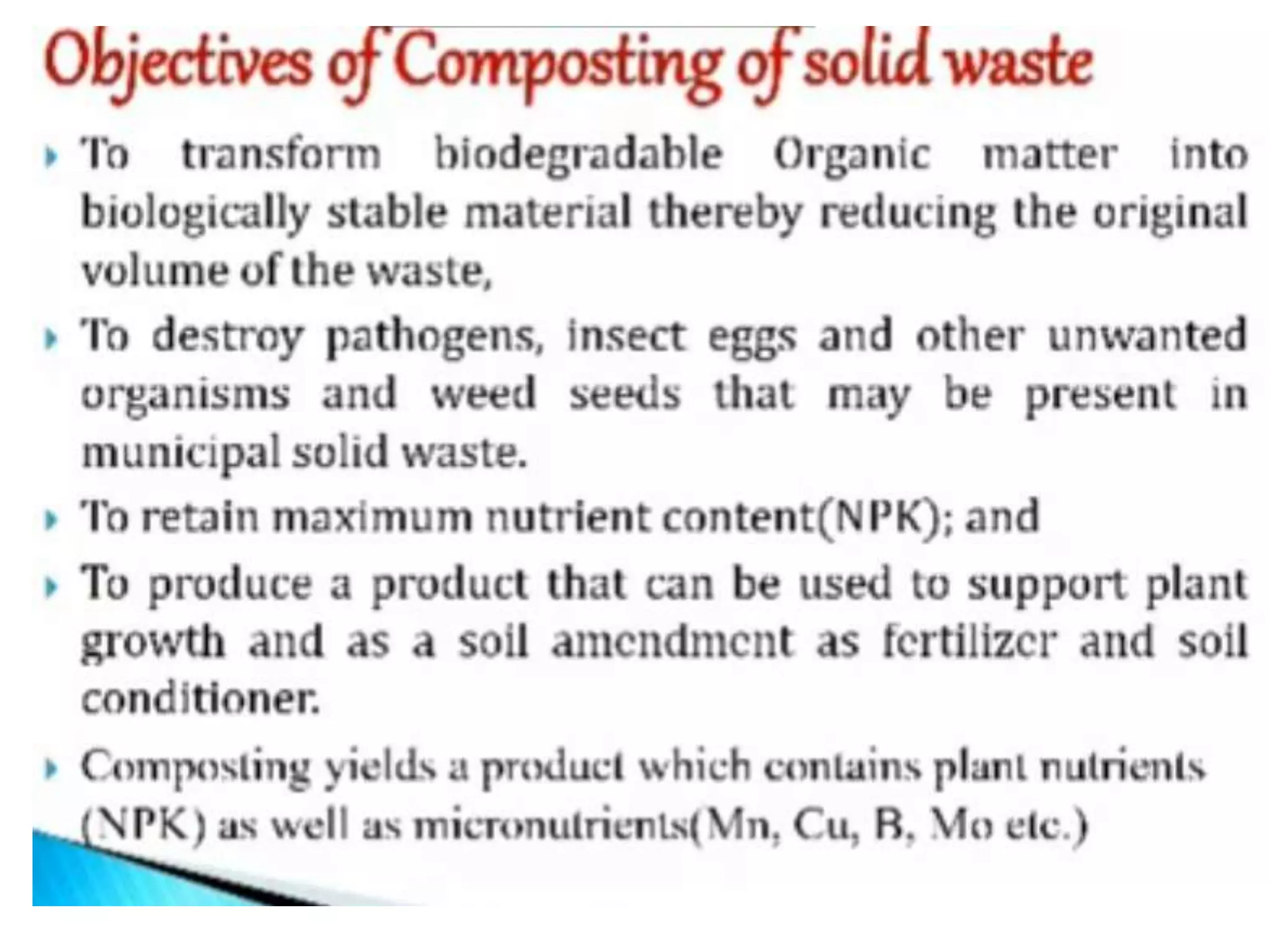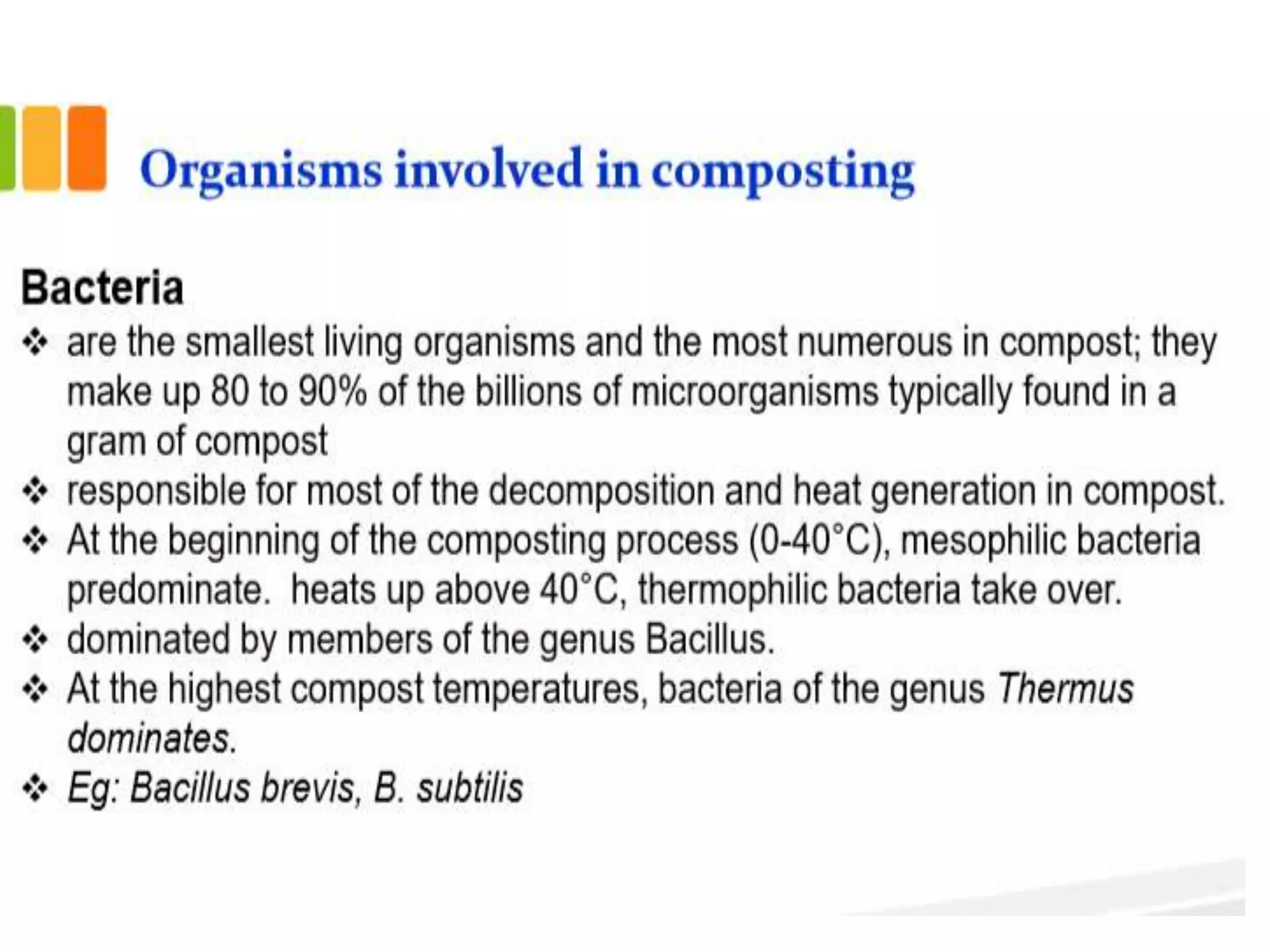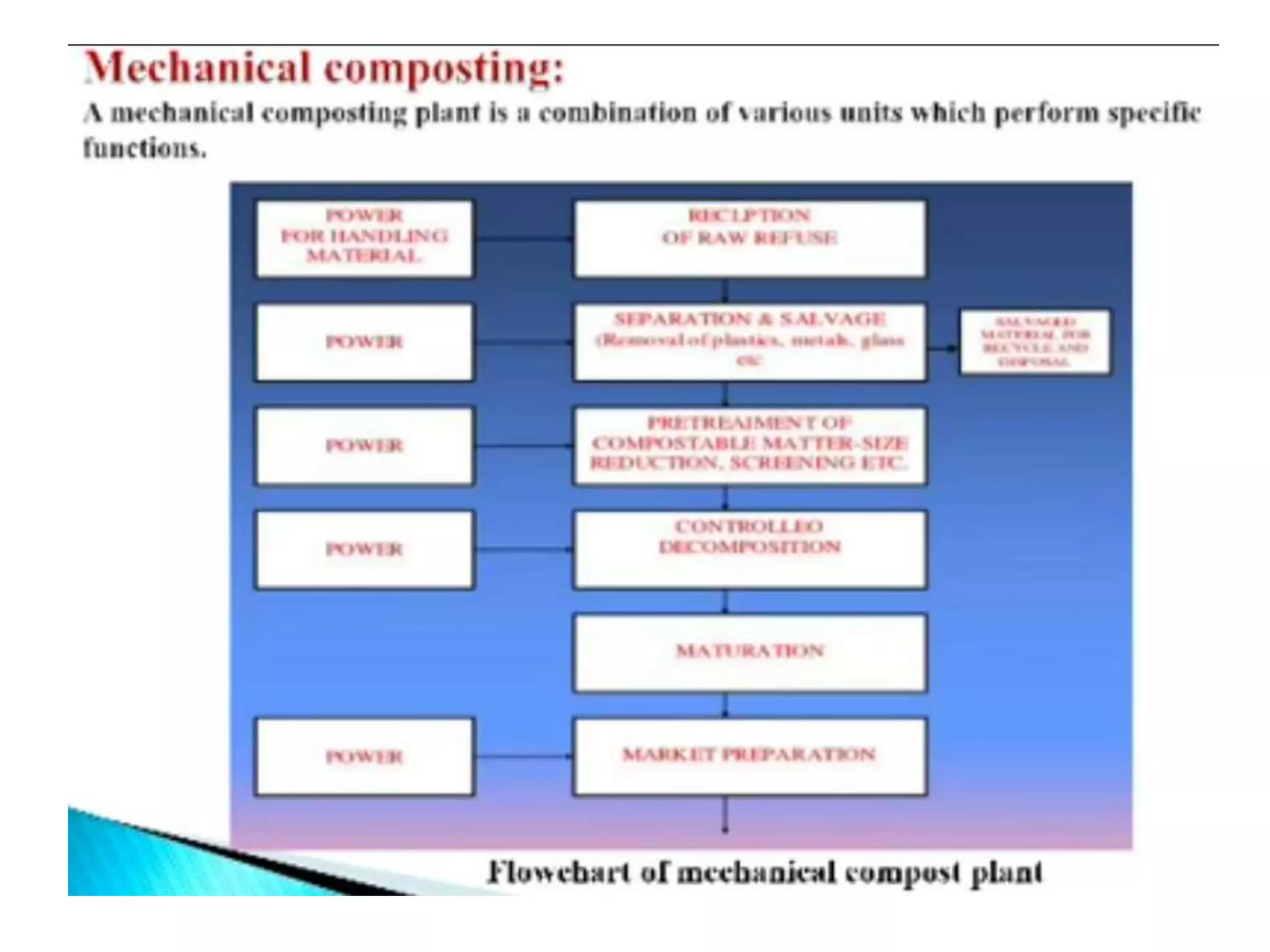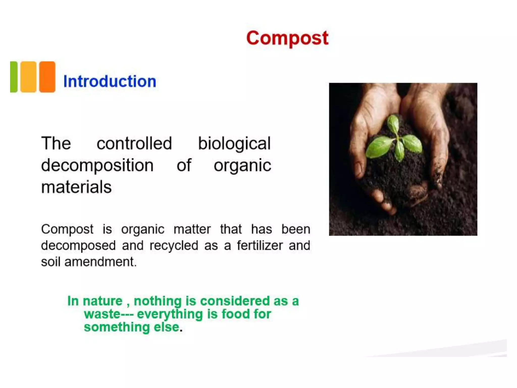 This document discusses different types of composting processes and factors that affect composting. It describes aerobic composting, which uses air and breaks down organic waste quickly without smell, and anaerobic composting, which does not use air and breaks down waste slowly with an unpleasant smell. It outlines organisms, moisture levels, temperatures, carbon to nitrogen ratios, and aeration involved in effective composting. Optimum conditions for composting include a moisture level of 50-60%, temperatures of 50-60 degrees Celsius, a carbon to nitrogen ratio of 30:1, and adequate aeration.