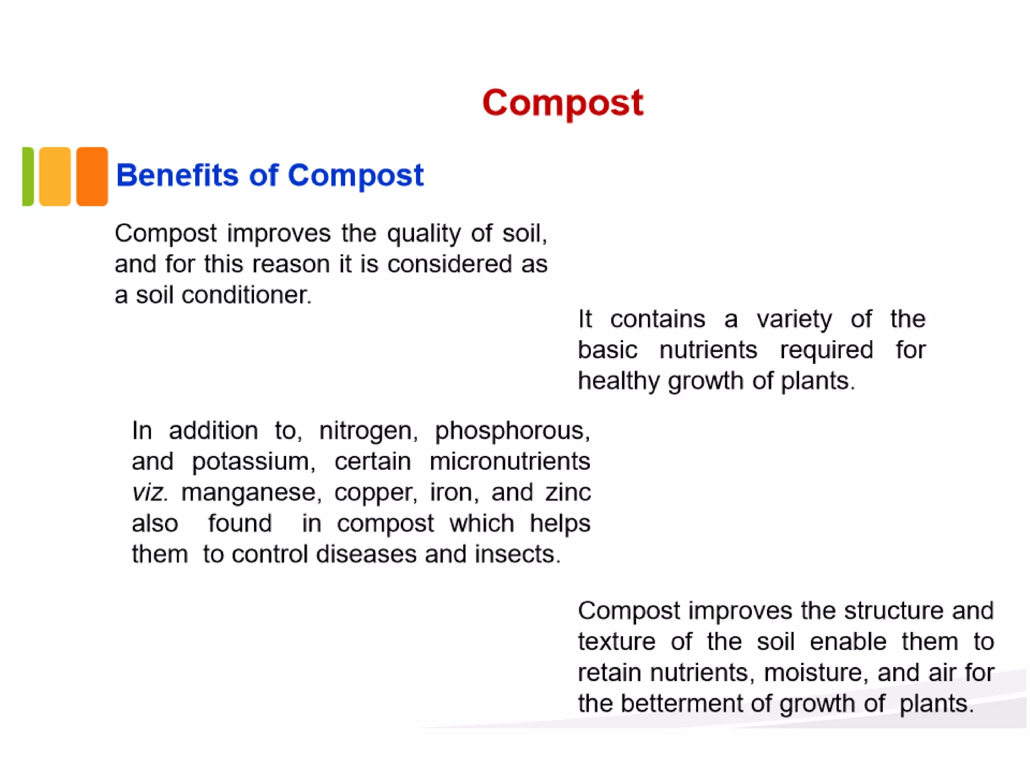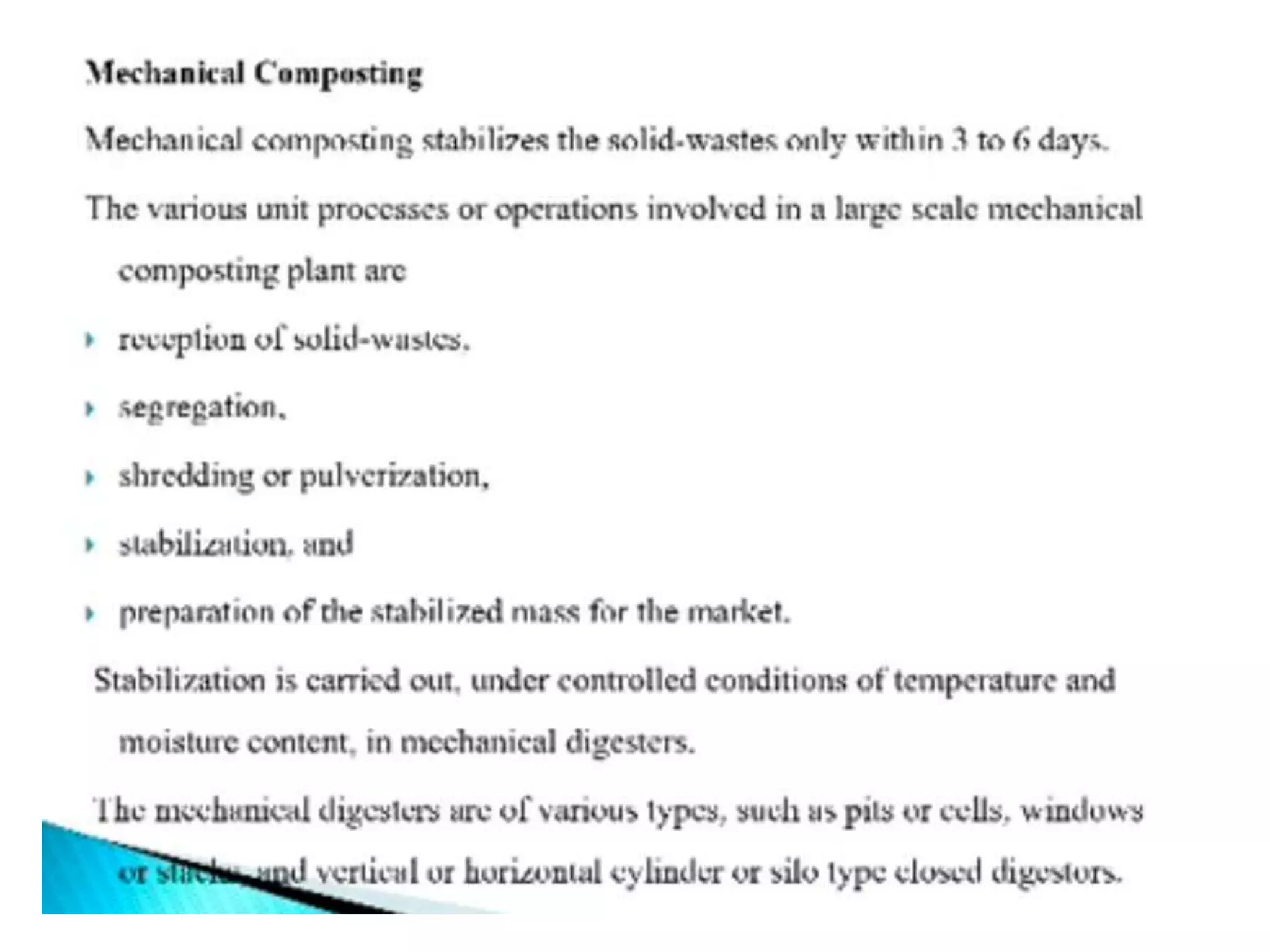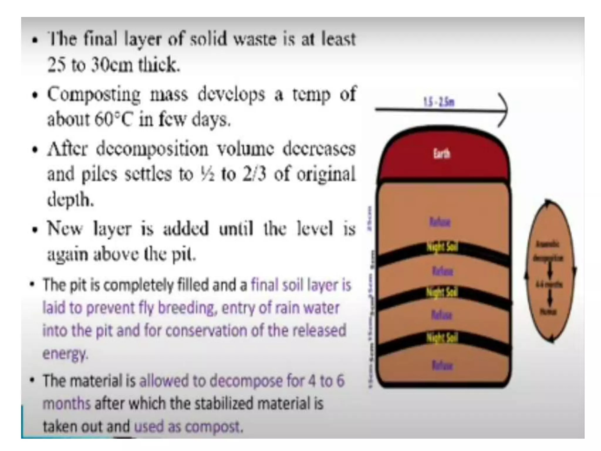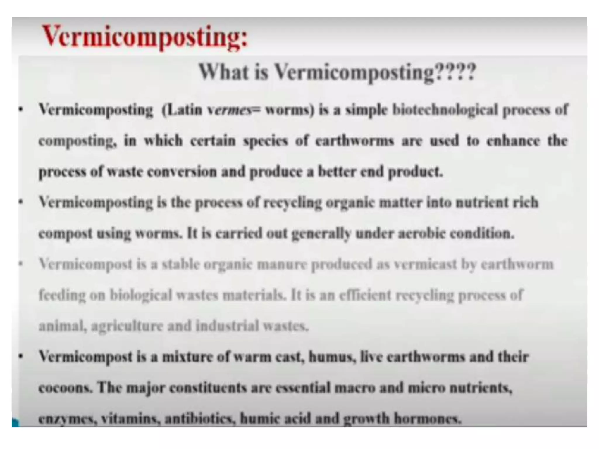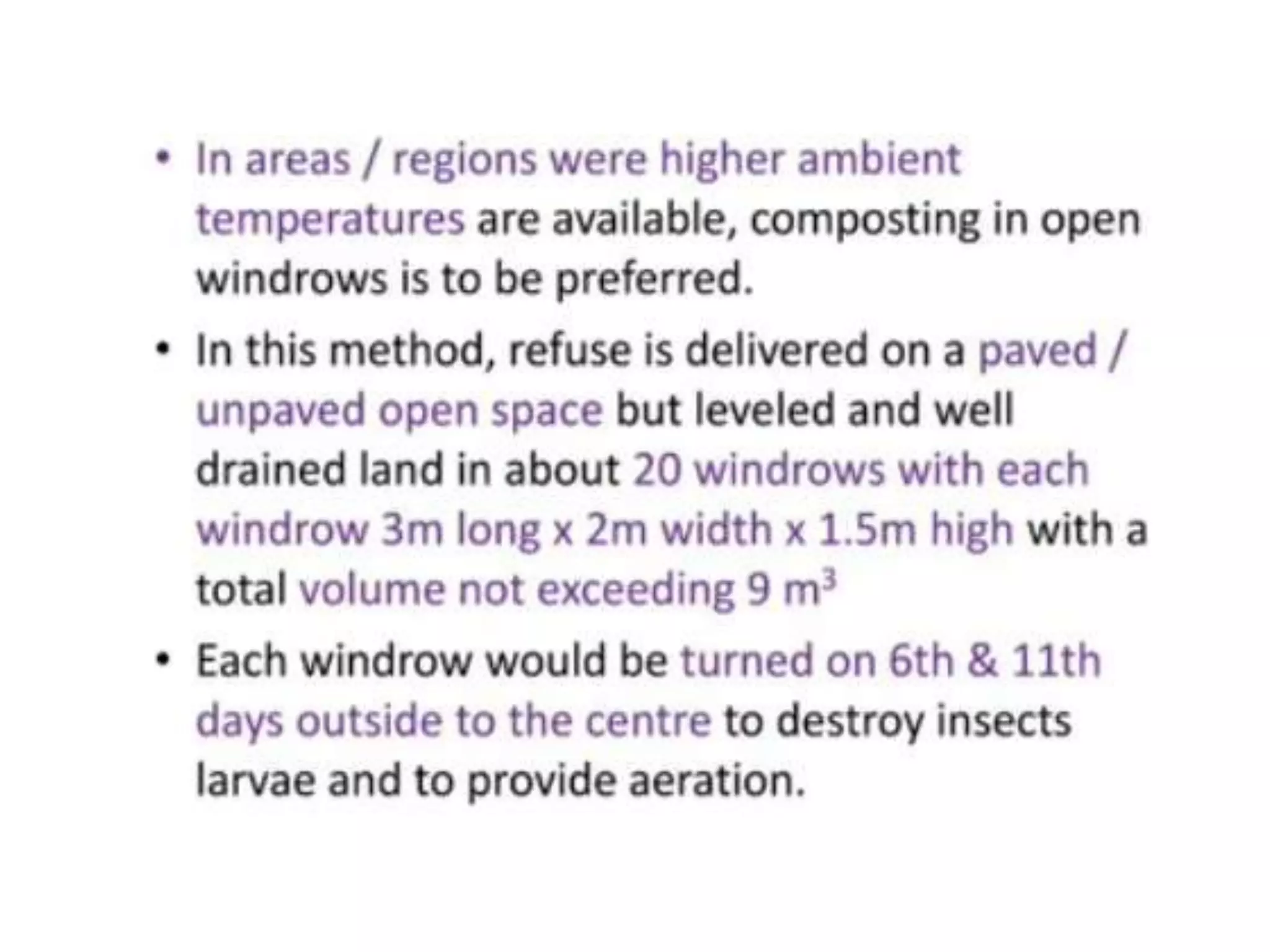 This document discusses different types of composting processes and factors that affect composting. It describes aerobic composting, which uses air and breaks down organic waste quickly without smell, and anaerobic composting, which does not use air and breaks down waste slowly with an unpleasant smell. It outlines organisms, moisture levels, temperatures, carbon to nitrogen ratios, and aeration involved in effective composting. Optimum conditions for composting include a moisture level of 50-60%, temperatures of 50-60 degrees Celsius, a carbon to nitrogen ratio of 30:1, and adequate aeration.