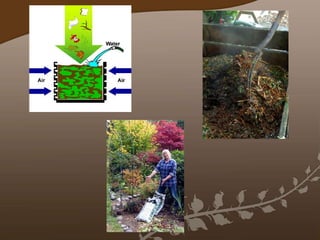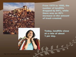 The document discusses the benefits of composting. It notes that while landfills are closing at a rate of one per day, trash creation has increased 80% since 1979. 40% of agricultural land is eroded globally. Composting can help address these problems by reducing landfill waste and mitigating soil erosion. The document defines compost and explains how composting yard trimmings and food waste could eliminate the need for 397 of the 1654 landfills in the US. It also discusses how composting techniques like Burkina Faso's zaï method can increase crop yields by 500% and help regenerate degraded lands.