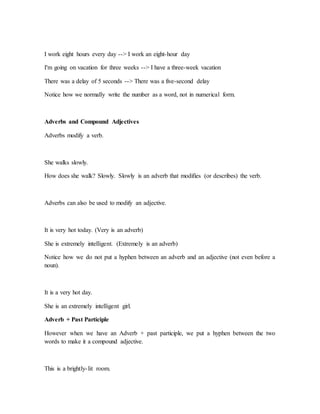 Compound adjectives are adjectives made up of two or more words joined by a hyphen. Examples include English-speaking, time-saving, and thirty-floor. Compound adjectives are formed by joining words with a hyphen before a noun to act as a single adjective describing it. There are different types of compound adjectives such as those using numbers and time periods, adverbs and past/present participles combined with nouns, and adjectives combined with nouns. Knowing when to use a hyphen depends on whether the words can be joined by "and"; if so, a hyphen is unnecessary.