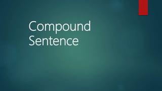 This document discusses different types of sentences: compound, complex, and compound-complex. It defines each sentence type and provides examples. A compound sentence contains at least two independent clauses joined with coordinating conjunctions. A complex sentence has one independent clause and one dependent clause joined by a subordinating conjunction. A compound-complex sentence is made up of at least two independent clauses and one dependent clause joined by conjunctions. The document also lists common coordinating and subordinating conjunctions and provides exercises for identifying sentence types.