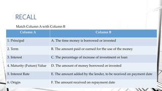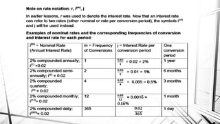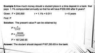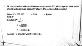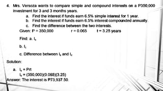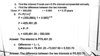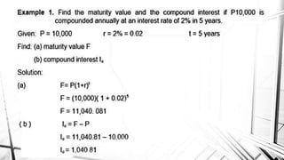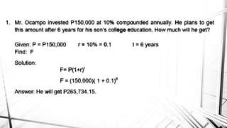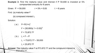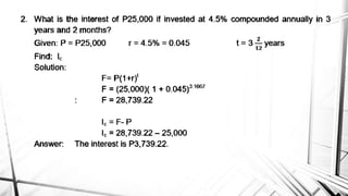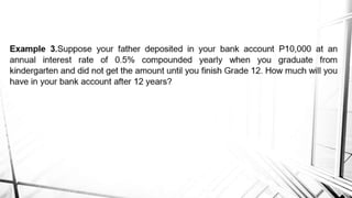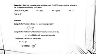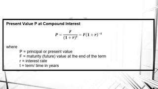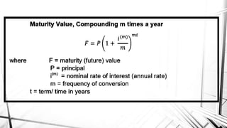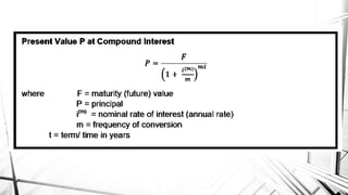 Compound interest is interest calculated on the initial principal and also on the accumulated interest from previous periods of time. More frequent compounding results in higher total interest earned over time. For example, compounding interest semi-annually instead of annually means interest is earned twice as often, leading to greater overall growth of the principal amount. The document provides examples of compound interest calculations using common formulas and variables like principal, interest rate, time period, and future/maturity value.