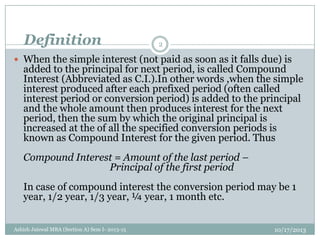 1) Compound interest occurs when interest is added to the principal amount each period, so that interest is earned on interest.