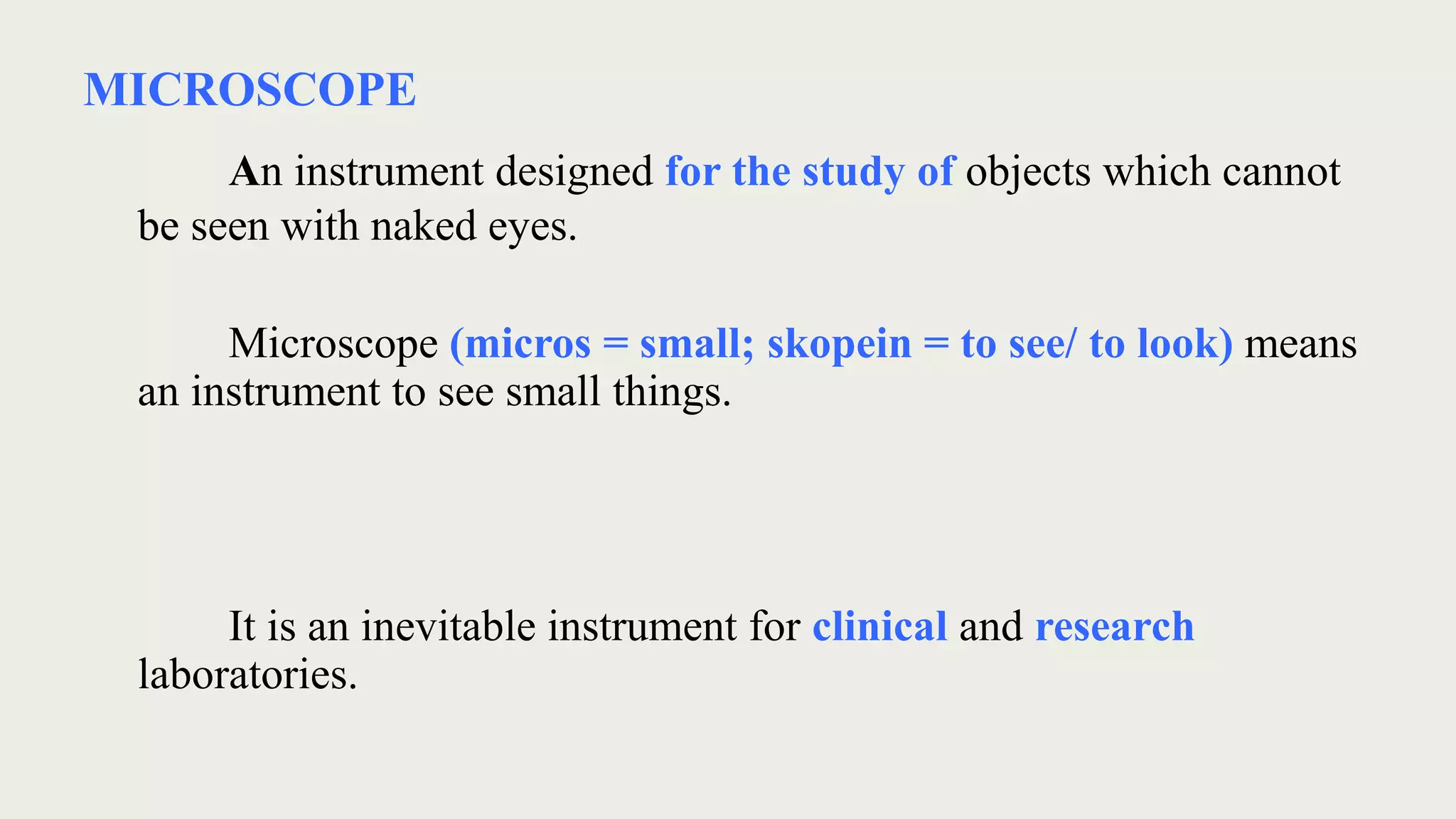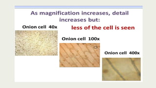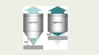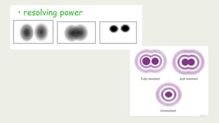 The document discusses microscopes, focusing on their definition, types, and usage in clinical and research laboratories. It details various types of microscopes, including light and compound microscopes, and explains the principles of magnification and resolving power. Additionally, it outlines the structure and components of a compound microscope and its applications in fields like pathology and forensics.