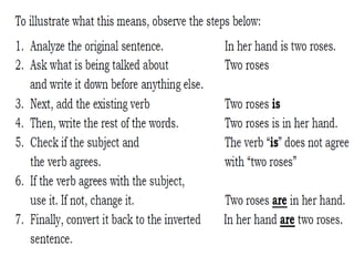 This document discusses different types of sentences: compound, complex, and inverted. It defines each type and provides examples. A compound sentence joins two independent clauses with a conjunction or semicolon. A complex sentence has one independent clause and one dependent clause joined by a subordinating conjunction. Inverted sentences reverse the typical subject-verb order, which can cause confusion over subject-verb agreement. The document also discusses adjectives, their types and uses.