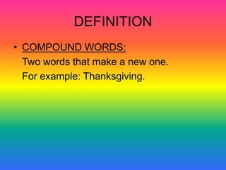 Compound words are formed by combining two existing words to create a new one. An example of a compound word is 'thanksgiving'. This document provides a brief definition of compound words.