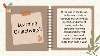 This document provides examples and explanations for computing compound interest when it is compounded more than once per year. It defines key terms like nominal interest rate, frequency of conversion, and interest rate per conversion period. Examples are provided to demonstrate calculating maturity value, interest, and present value for principal amounts compounded quarterly, semi-annually, and monthly over various time periods. Practice problems at the end involve using the concepts and formulas taught to solve for unknown values in compound interest scenarios.