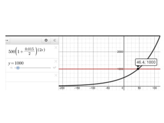 Sheldon deposits $500 into a bank account paying annual interest of 1.5%. The document shows the calculation to determine how long it will take for the initial deposit to double to $1000 using the compound interest formula. An equation is set up and solved to find that it will take approximately 5 years for Sheldon's money to double.