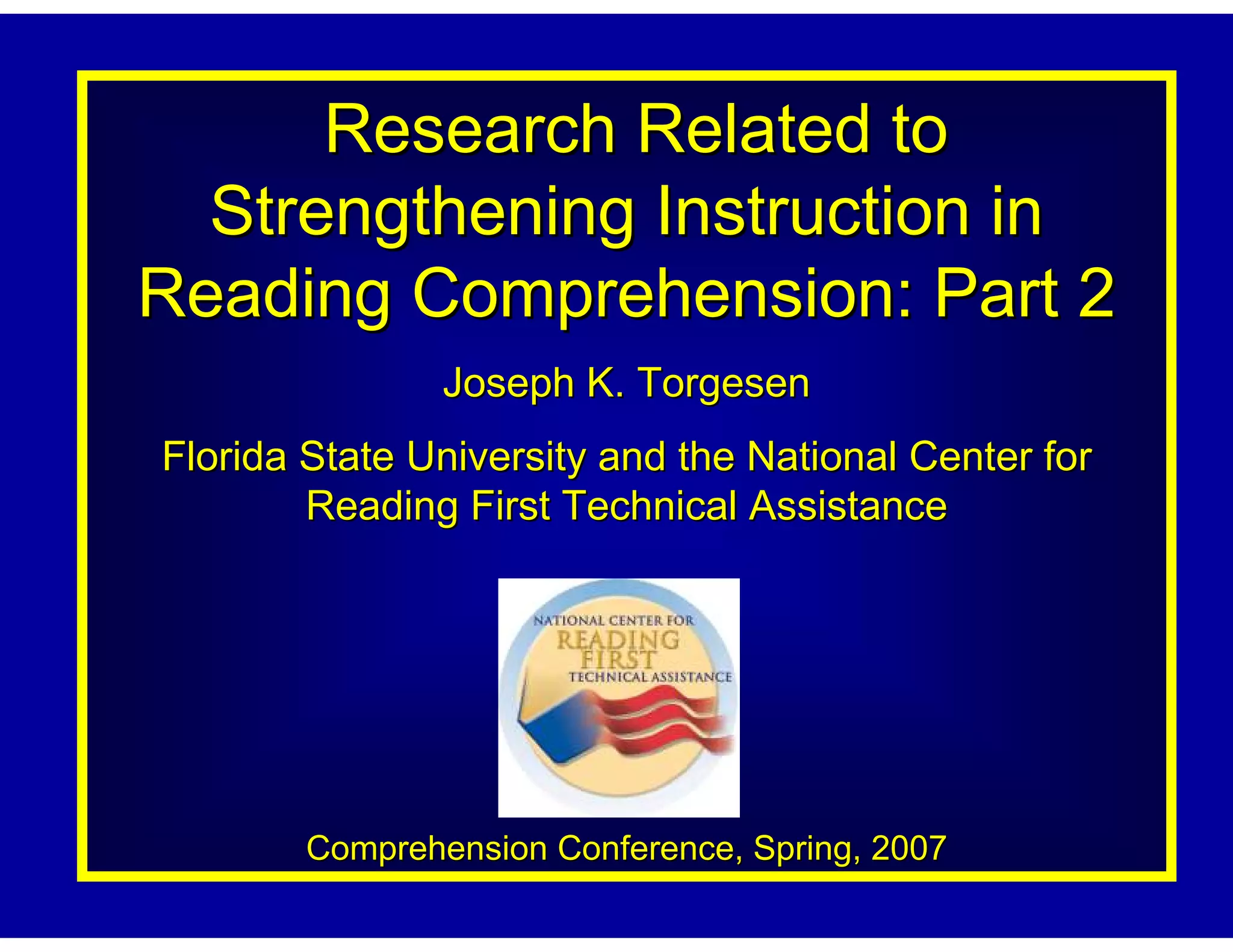 Direct instruction in reading comprehension strategies has been shown to improve students' reading comprehension. Proficient readers actively monitor their understanding and use strategies like generating questions, making predictions, and summarizing when comprehension breaks down. Research shows that explicitly teaching students strategies like question generation, summarizing, and using graphic organizers leads to better comprehension of texts read during lessons. While most studies show short-term gains, some evidence indicates instruction can develop independent strategy use and transfer to broader measures of reading ability.