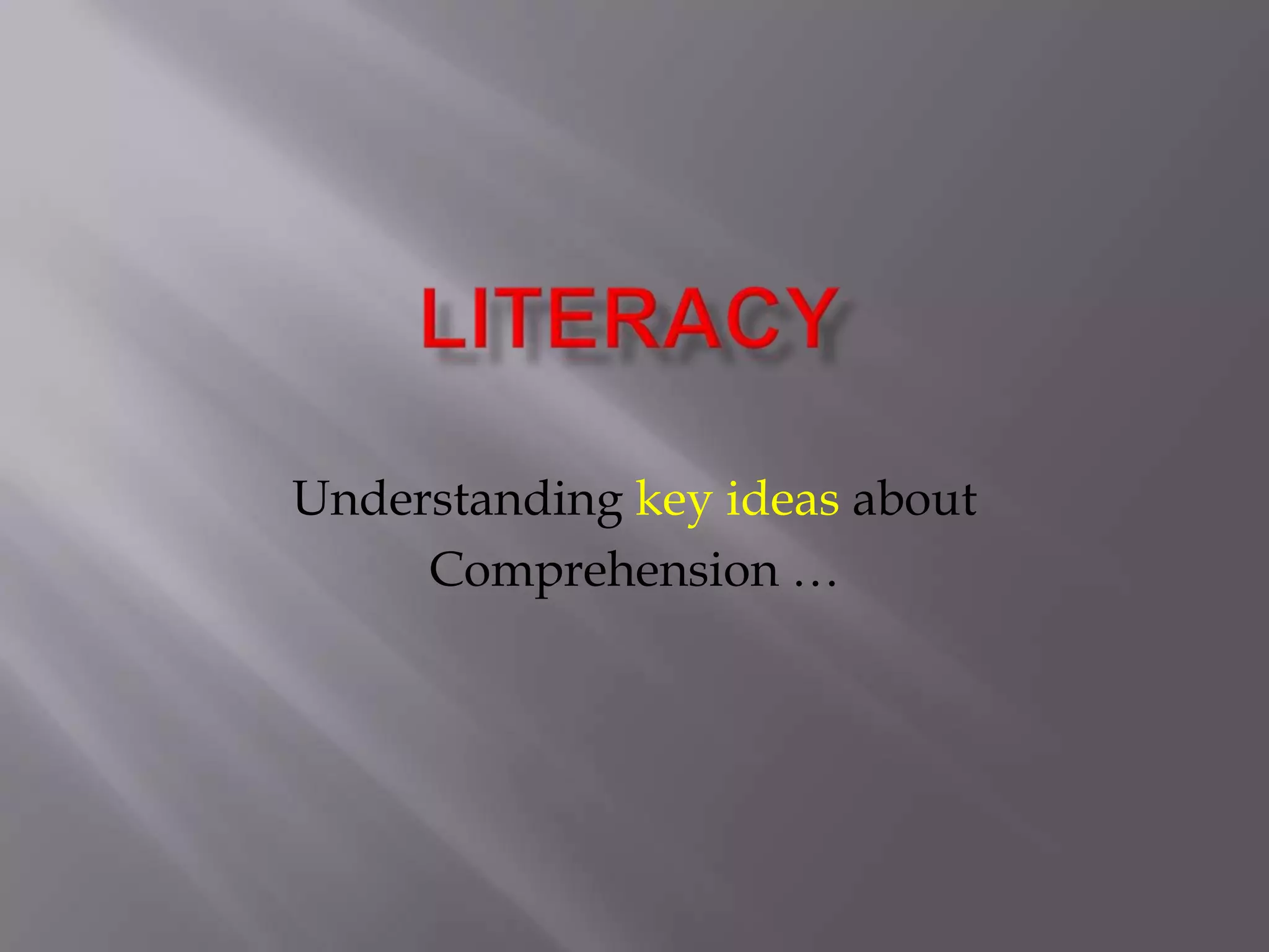 Literacy involves explicitly teaching comprehension strategies to students. Teachers should model, explain, and have students practice comprehension strategies with support. They should continue using strategies independently over multiple school years. Good readers use strategies like activating prior knowledge, making connections, questioning, visualizing, inferring, summarizing, evaluating, and synthesizing. Strategies work best when combined and include opportunities for reading, comprehension instruction, peer learning, and discussion. Specific strategies like annolighting and three-level guides provide scaffolds to help students interact with texts at a literal, interpretive, and applied level.