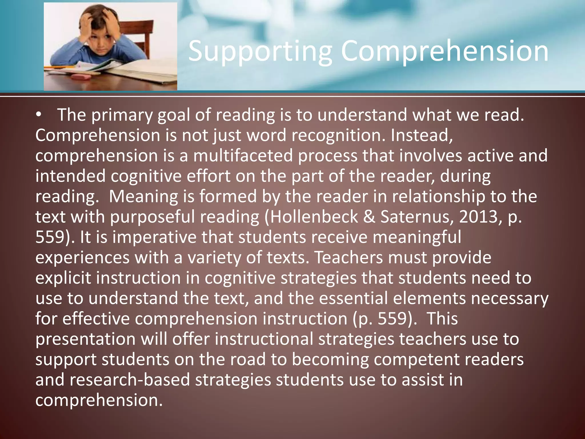 This document discusses strategies for supporting reading comprehension. It explains that comprehension is an active process that involves cognitive effort on the part of the reader. Teachers must provide explicit instruction in comprehension strategies and ensure students have experience with a variety of texts. Affective factors like metacognition, motivation, beliefs, and self-efficacy also influence comprehension and must be considered in instructional plans. The document outlines specific comprehension strategies like inferring, summarizing, and think-alouds that teachers can model and students can practice. It stresses the importance of differentiation, scaffolded instruction, and incorporating collaborative learning activities to meet diverse student needs.