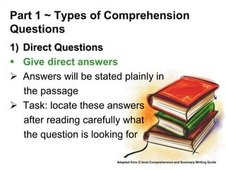 The document discusses the different types of comprehension questions that may be asked about a passage. It outlines four main types: direct questions, inferential questions, rephrasing questions, and vocabulary questions. Direct questions can be answered directly from the text, while inferential questions require reading between the lines to deduce the answer. Rephrasing questions ask the reader to explain a phrase or sentence in their own words. Vocabulary questions focus on defining or explaining the meaning of a word used in the passage. The document also discusses making intelligent guesses through logical or empirical inference when a question is not directly answered in the text.