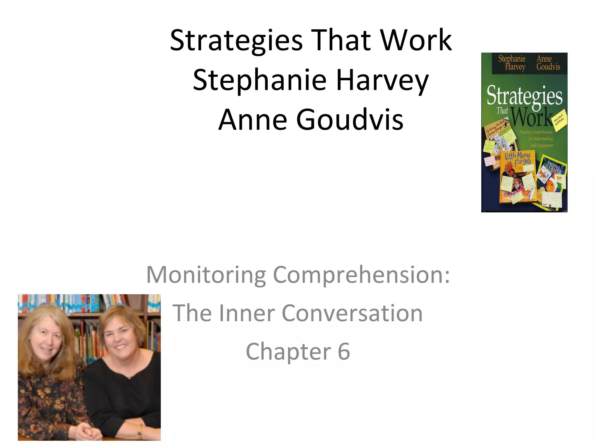 The document discusses strategies for teaching students to monitor their comprehension while reading. It recommends teaching students to engage in an "inner conversation" with the text by asking questions, making connections, and noting their reactions. Teachers should model their own inner thinking and ask open-ended questions to guide student discussion. Students can record their thinking using sticky notes. The goal is for students to continuously build knowledge as they read and know when they understand versus when they are confused.