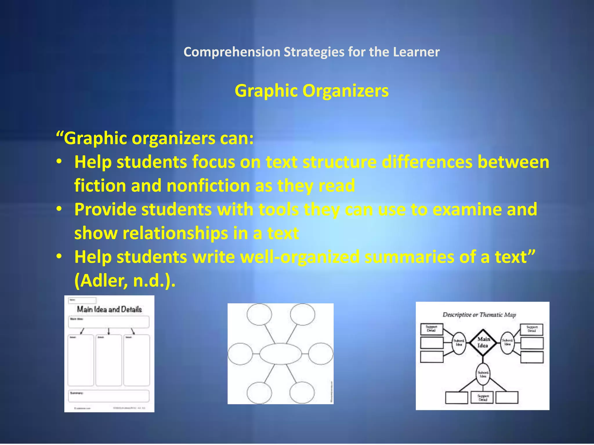 This document discusses various comprehension strategies and instructional strategies to support students' reading comprehension. It describes strategies like graphic organizers, fix-up strategies, and elaborate interrogation that students can use to understand texts. Instructional strategies discussed for teachers include think-pair-share, START, and scaffolding approaches. The document also distinguishes between comprehension strategies, which are tools for students, and instructional strategies, which teachers use to support comprehension.