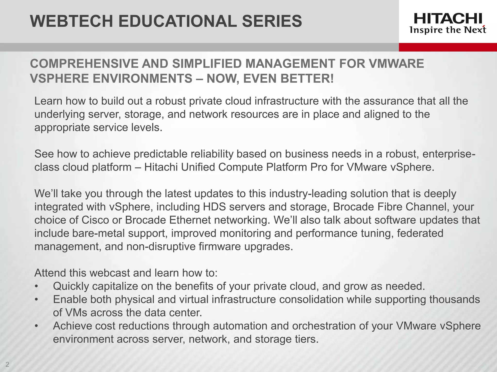 The document discusses the enhancements in managing VMware vSphere environments using Hitachi's Unified Compute Platform (UCP) Pro, which offers streamlined private cloud infrastructure management. It outlines updates including improved monitoring, performance tuning, and automation, highlighting the importance of infrastructure convergence for enterprise efficiency. Upcoming webcasts are also mentioned for further exploration of private cloud solutions and associated technologies.