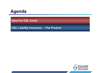 The document outlines the need for Comprehensive General Liability (CGL) insurance, emphasizing its coverage for third-party bodily injury and property damage arising from business operations. It highlights various claims examples, such as injuries from accidents and damages due to product defects, and details the specific coverage provided, including public liability and product liability. Additionally, it discusses the requirements, exclusions, and process for obtaining CGL insurance, along with key sectors that require such coverage.