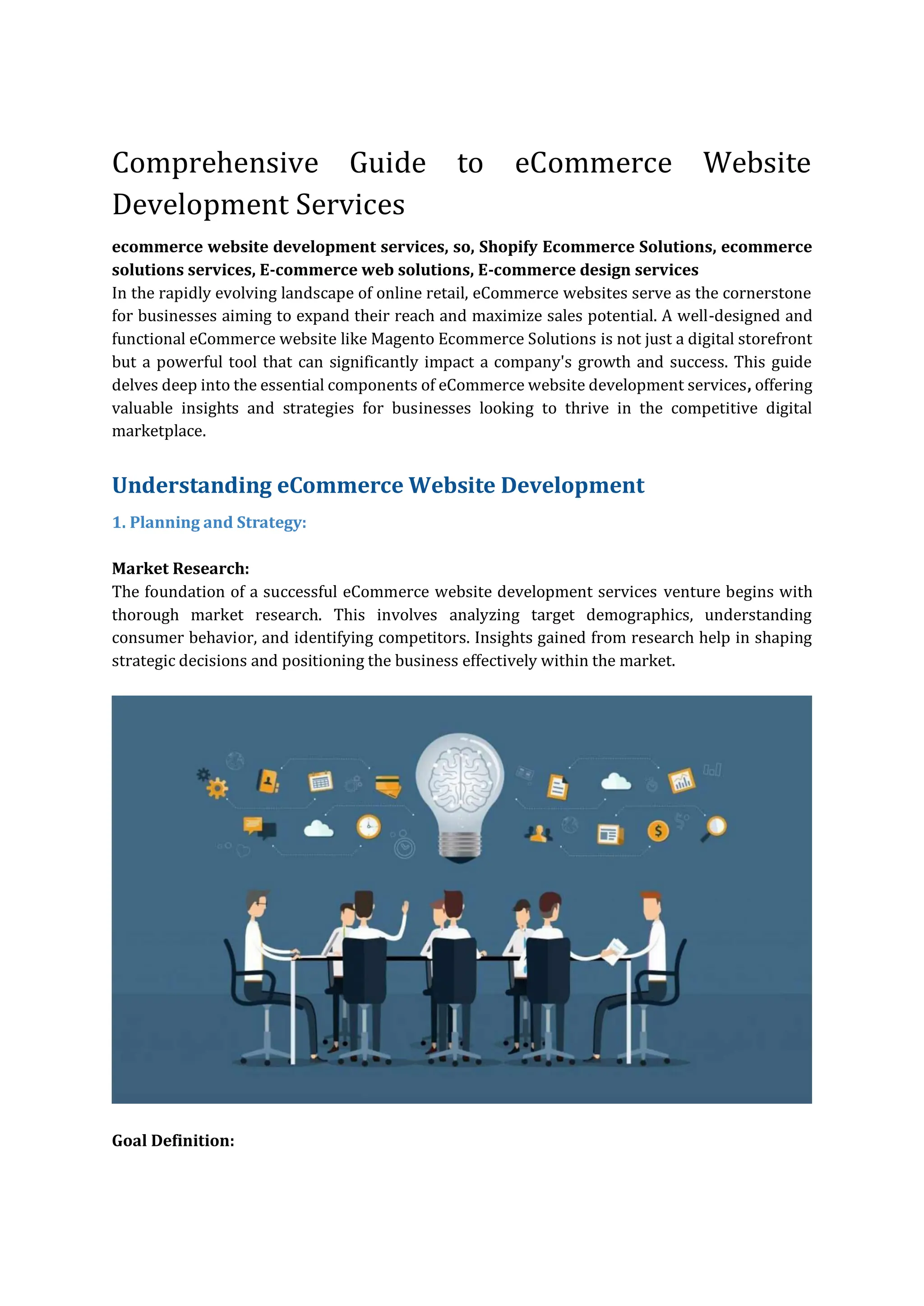This document serves as a comprehensive guide to ecommerce website development services, emphasizing the significance of well-designed ecommerce platforms for business growth. It covers crucial aspects such as market research, user experience design, platform selection, content management, and the benefits of hiring professionals. The guide concludes that meticulous planning and leveraging expert services are key to creating successful ecommerce websites that drive sales and customer loyalty.