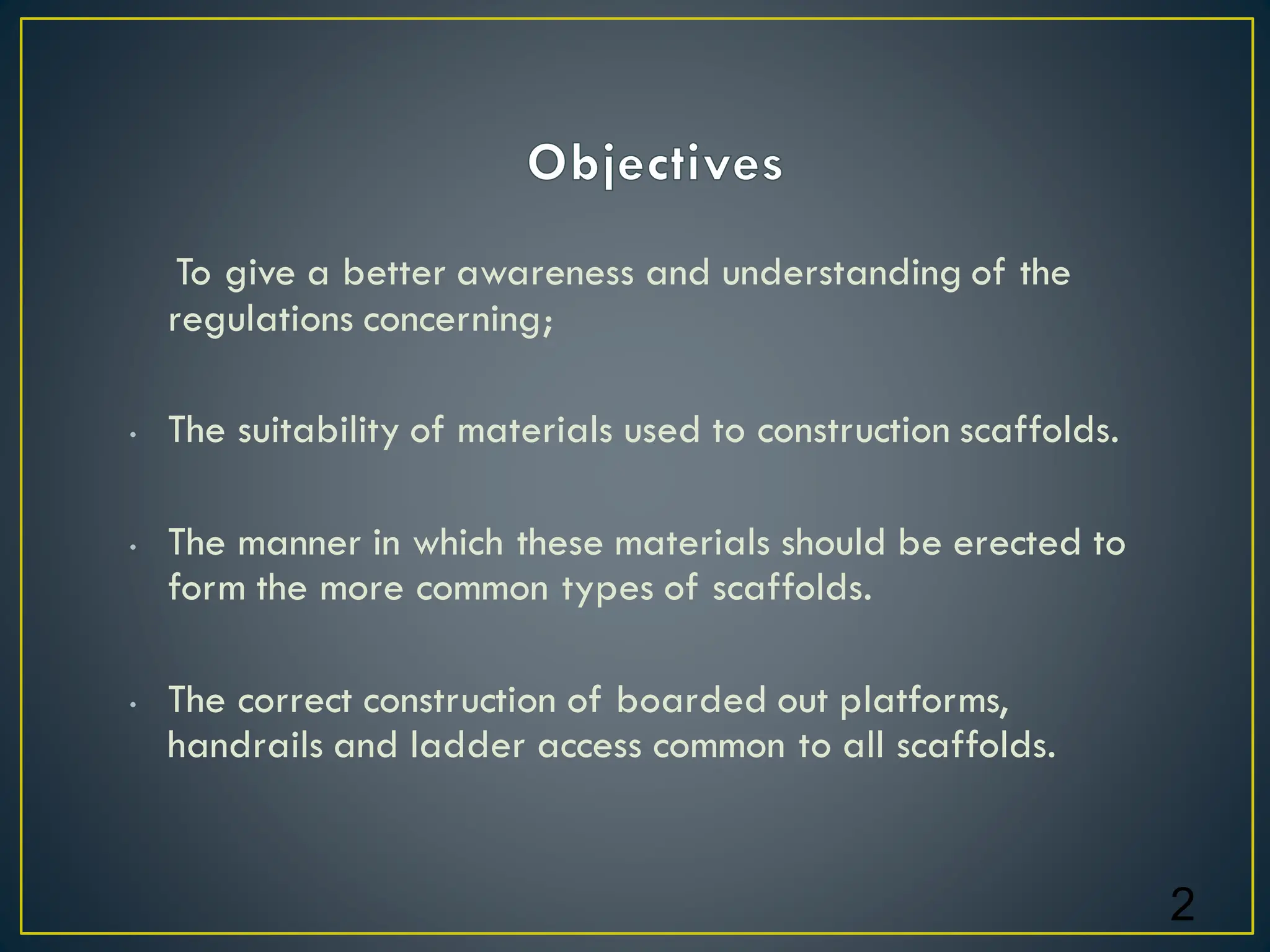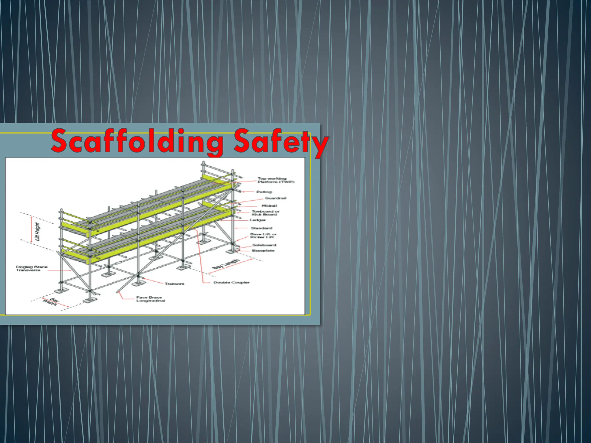 • The suitability of materials used to construction scaffolds.