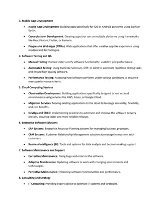 The document provides a comprehensive overview of software development services, which include custom software development, web and mobile app development, software testing and QA, cloud computing services, enterprise software solutions, maintenance, consulting, and emerging technologies. It emphasizes the importance of selecting the right software development partner based on expertise, portfolio, communication, value, and post-development support. By leveraging these services, businesses can create effective software solutions that enhance growth and efficiency.
