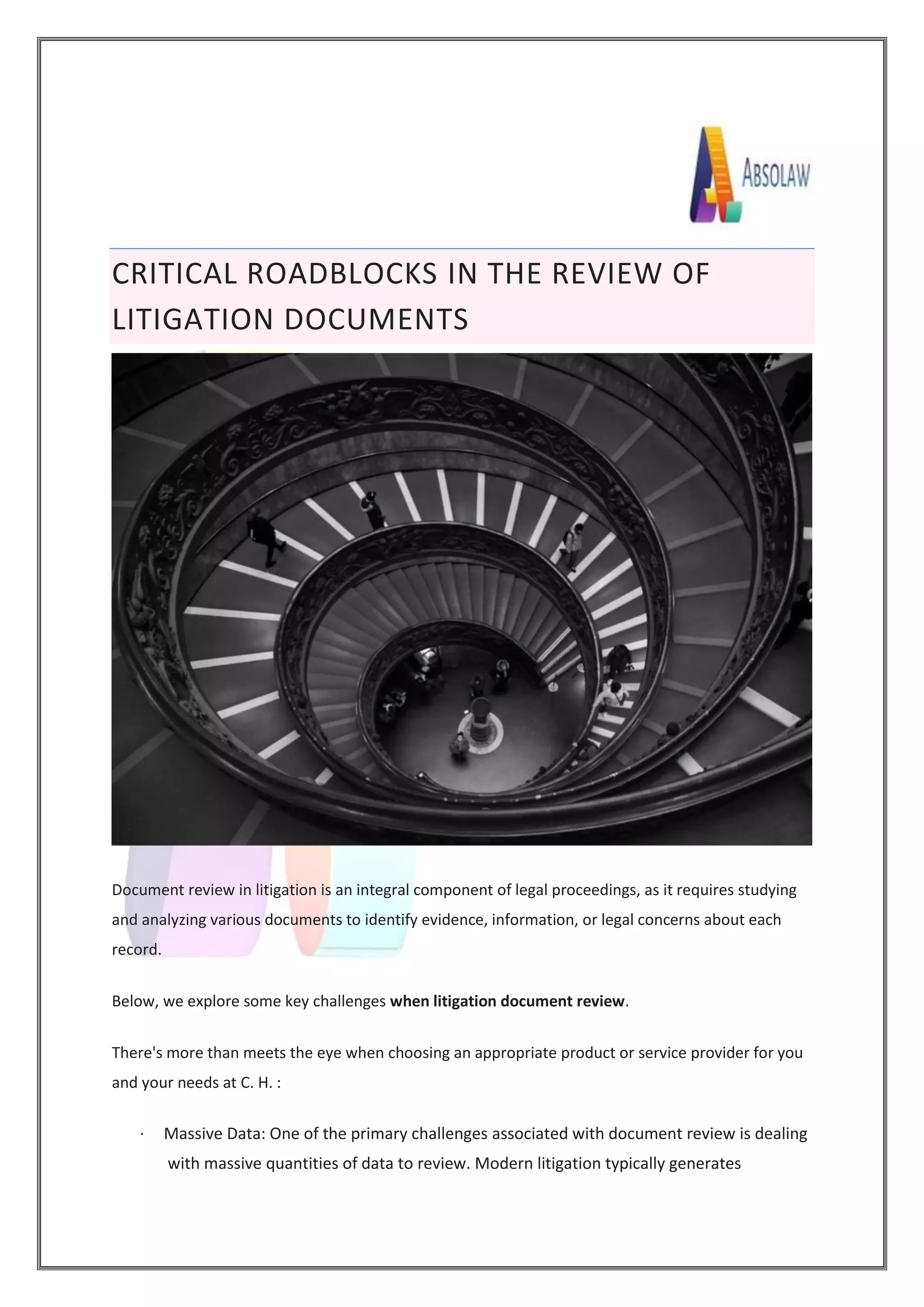 The document discusses key challenges in litigation document review, including the management of massive data volumes, the complexities of data collection and organization, and the importance of information security. It outlines the role of legal document services in assisting clients with document preparation, review, legal research, and administrative support, ensuring compliance and accuracy in legal proceedings. Additionally, it highlights Absolaw's services aimed at improving efficiency for clients in need of litigation support.