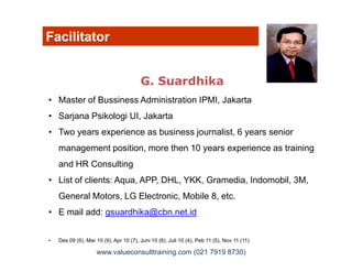 Dokumen tersebut merupakan materi pelatihan manajemen kinerja dan kepemimpinan yang diselenggarakan oleh Value Consult Training. Materi pelatihan meliputi pengertian manajemen kinerja, manajemen diri, manajemen orang, komunikasi, dan tinjauan kepemimpinan. Pelatihan ditujukan untuk meningkatkan kinerja karyawan dan tim melalui pengelolaan sumber daya secara efektif dalam jangka pendek dan panjang.