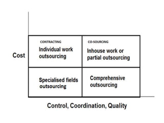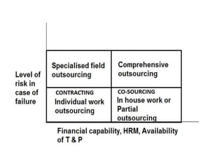 The document discusses outsourcing of civil engineering maintenance work. It defines outsourcing and describes how comprehensive outsourcing of all maintenance services under one contract is being implemented for a residential campus. Only 2 bidders were technically qualified and performance has been found to be better with improved quality of service, coordination among disciplines and customer satisfaction. Issues related to workers and supervisors still need resolution.