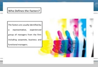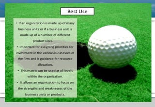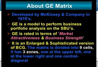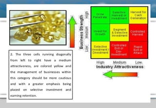 The document discusses portfolio analysis using frameworks like the BCG and GE/McKinsey matrices. It outlines the purpose of portfolio analysis, which includes evaluating strategic business units (SBUs) for investment and growth strategies, while explaining the characteristics of stars, cash cows, dogs, and question marks. Limitations and advantages of these matrices are also highlighted, emphasizing the need for a nuanced approach to industry attractiveness and competitive strength.