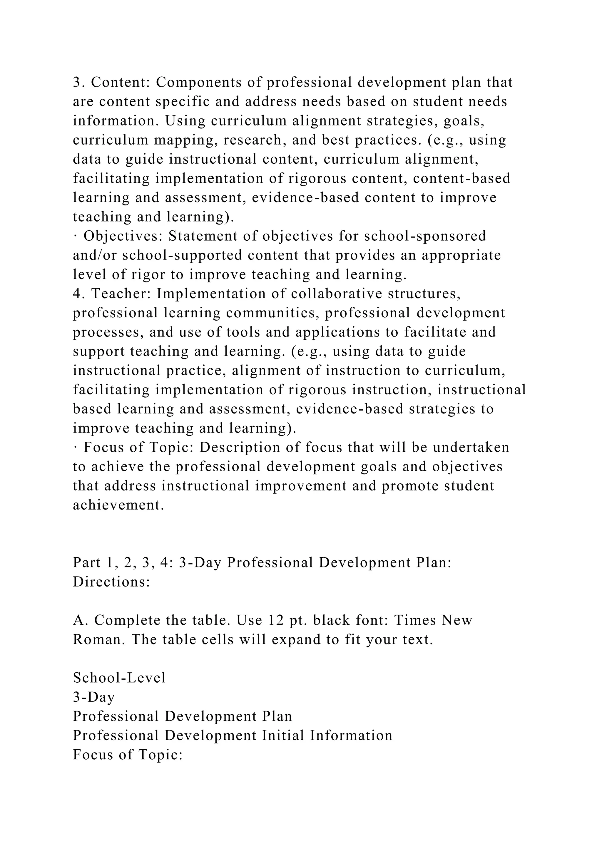 The document outlines a comprehensive 3-day professional development plan aimed at improving instructional leadership and teachers' practices. It details four essential elements of the plan: initial information, student achievement, content, and teacher implementation, with specific objectives for each day of development focused on data-driven instruction, curriculum alignment, and instructional practices. Additionally, it emphasizes the importance of reflections on the impact of professional development on K-12 student learning, including strategies for future improvements based on data evaluations.