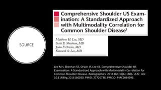 The document outlines a comprehensive approach to shoulder ultrasound examinations, focusing on standardized protocols for imaging various shoulder pathologies. It highlights the advantages of ultrasound, including real-time imaging and cost-effectiveness, while also discussing its limitations and challenges. The study emphasizes the importance of a structured examination framework to improve diagnostic accuracy and clinical implementation of shoulder ultrasound.