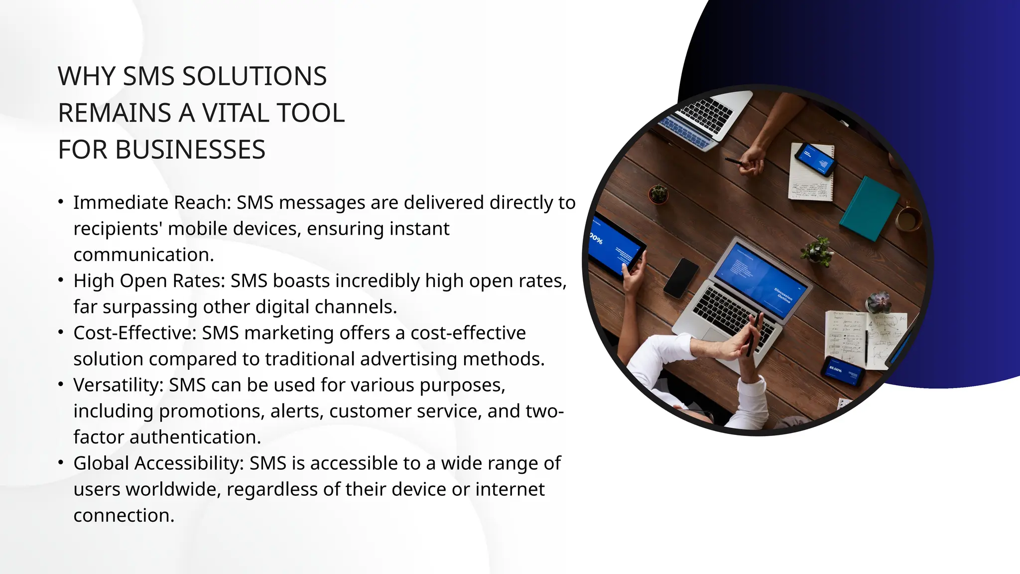 The document outlines the benefits and features of SMS solutions for businesses, highlighting their immediate reach, high open rates, and cost-effectiveness. It emphasizes the versatility of SMS for various applications such as marketing, customer support, and security. The SMS Point offers reliable, customizable, and affordable SMS solutions with integration capabilities and excellent customer support.