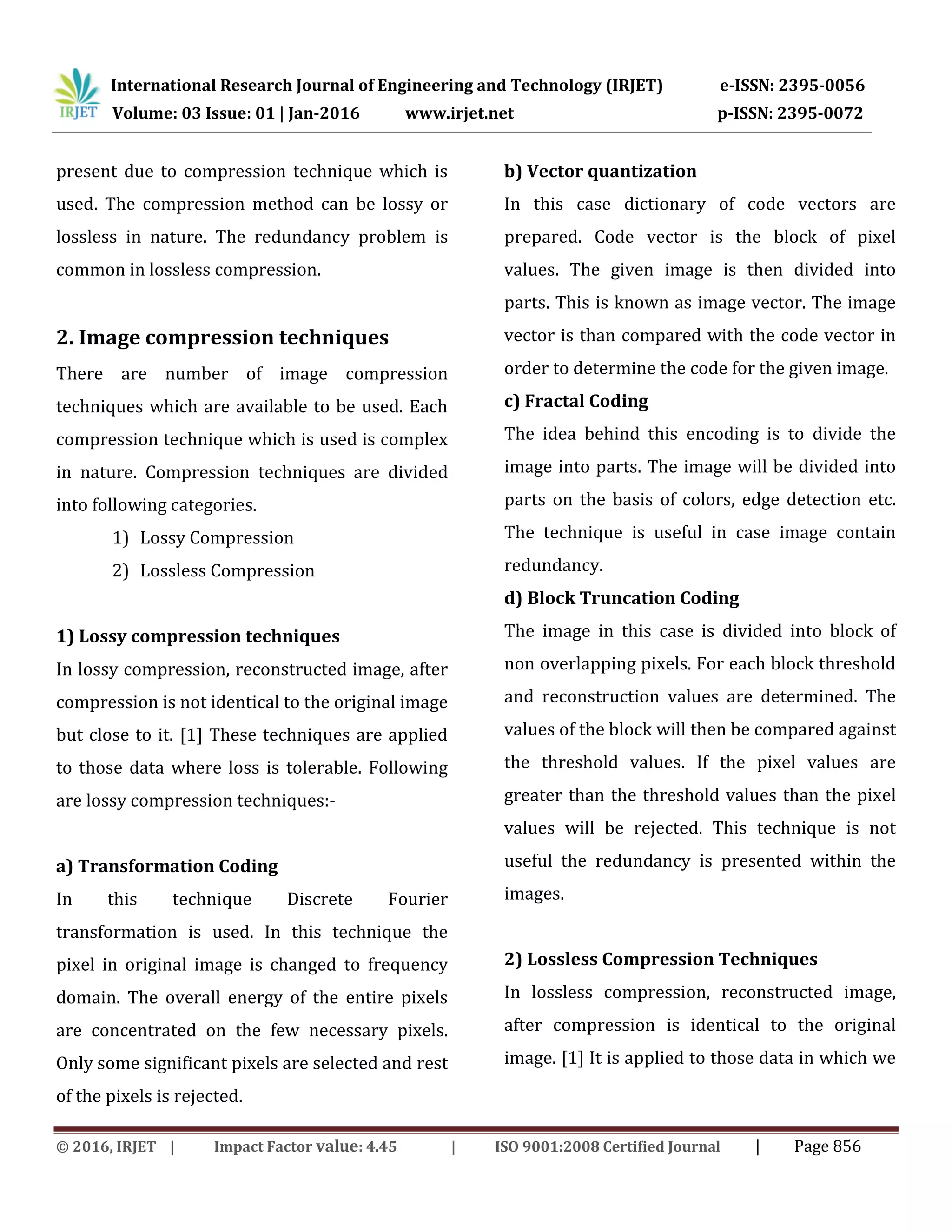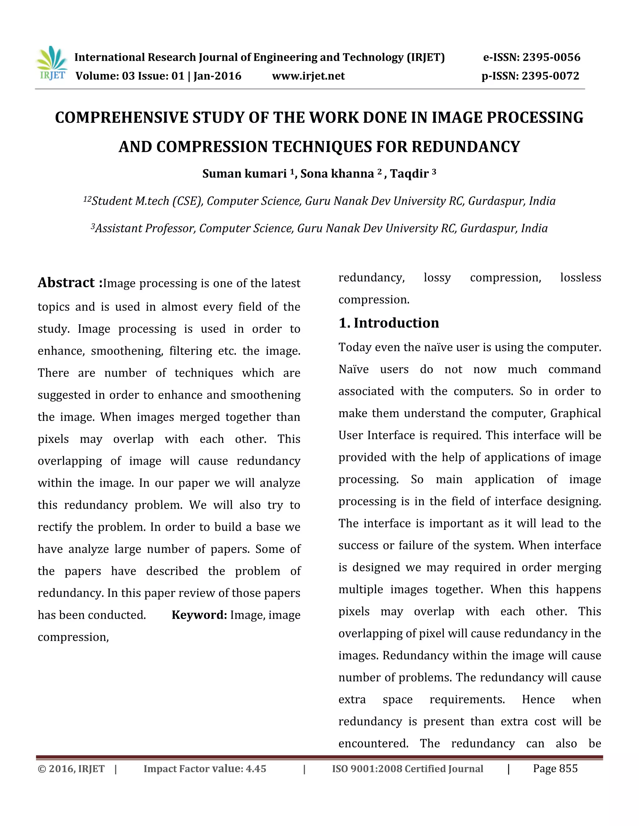This document summarizes research on image processing techniques to address redundancy. It discusses how overlapping pixels when merging images can cause redundancy, taking up extra space. It reviews papers analyzing redundancy problems from compression techniques. Lossy techniques like discrete cosine transform and lossless techniques like run length encoding and Huffman encoding are described for compressing images to reduce redundancy. The document also discusses using compression to eliminate irrelevant information from images.