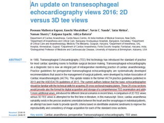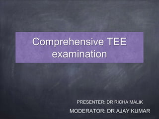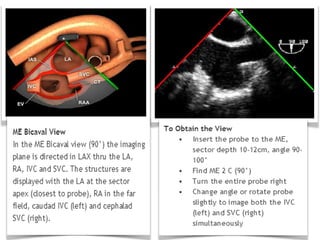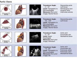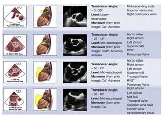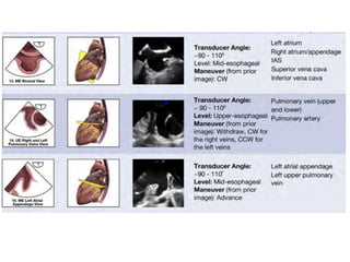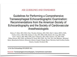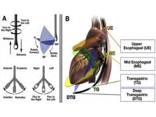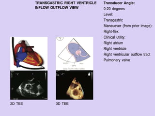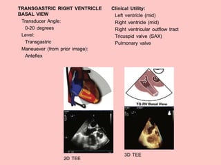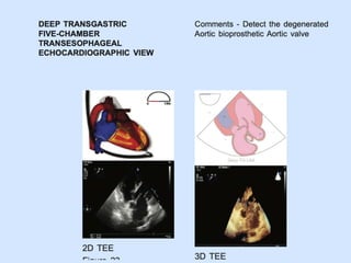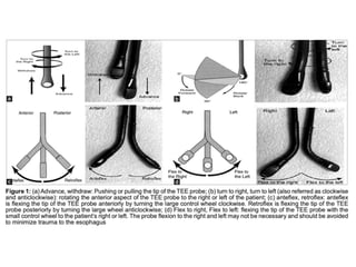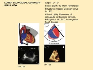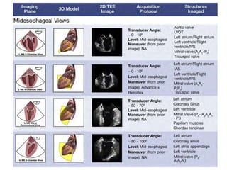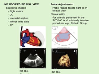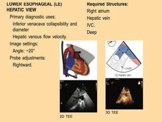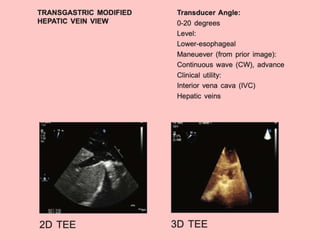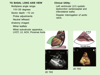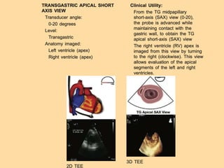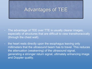 TEE provides clearer images of the heart compared to TTE due to the closer proximity of the esophagus to the heart. Some structures like the aorta, pulmonary artery and valves are better visualized with TEE. The standard TEE exam involves obtaining 20 predefined views of the heart from the mid-esophageal position and transgastric position. These views allow thorough examination of the valves, chambers, great vessels and other cardiac structures. Precautions must be taken when performing TEE to avoid complications like esophageal perforation.