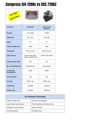 The document compares the Compress IUV-1200S printer with various competitors, highlighting features such as table size, speed, and ink costs. It showcases the advantages of the IUV-1200S, including a larger printable area and lower ink prices compared to models from DCS, LogoJet, and Mimaki. Additionally, it outlines essential features for selecting a small/medium format UV flatbed printer and provides information on GO UV-M ink compatibility and specifications.