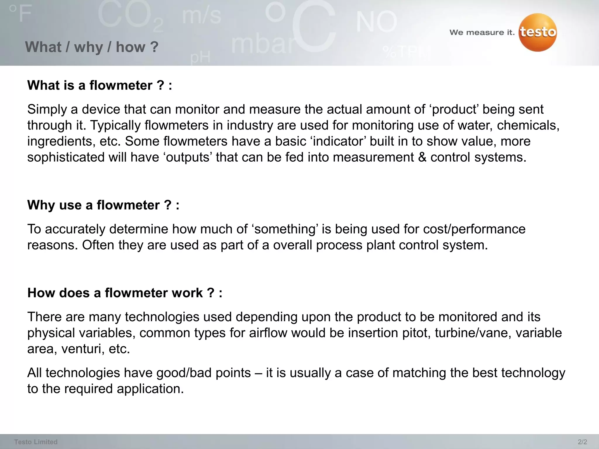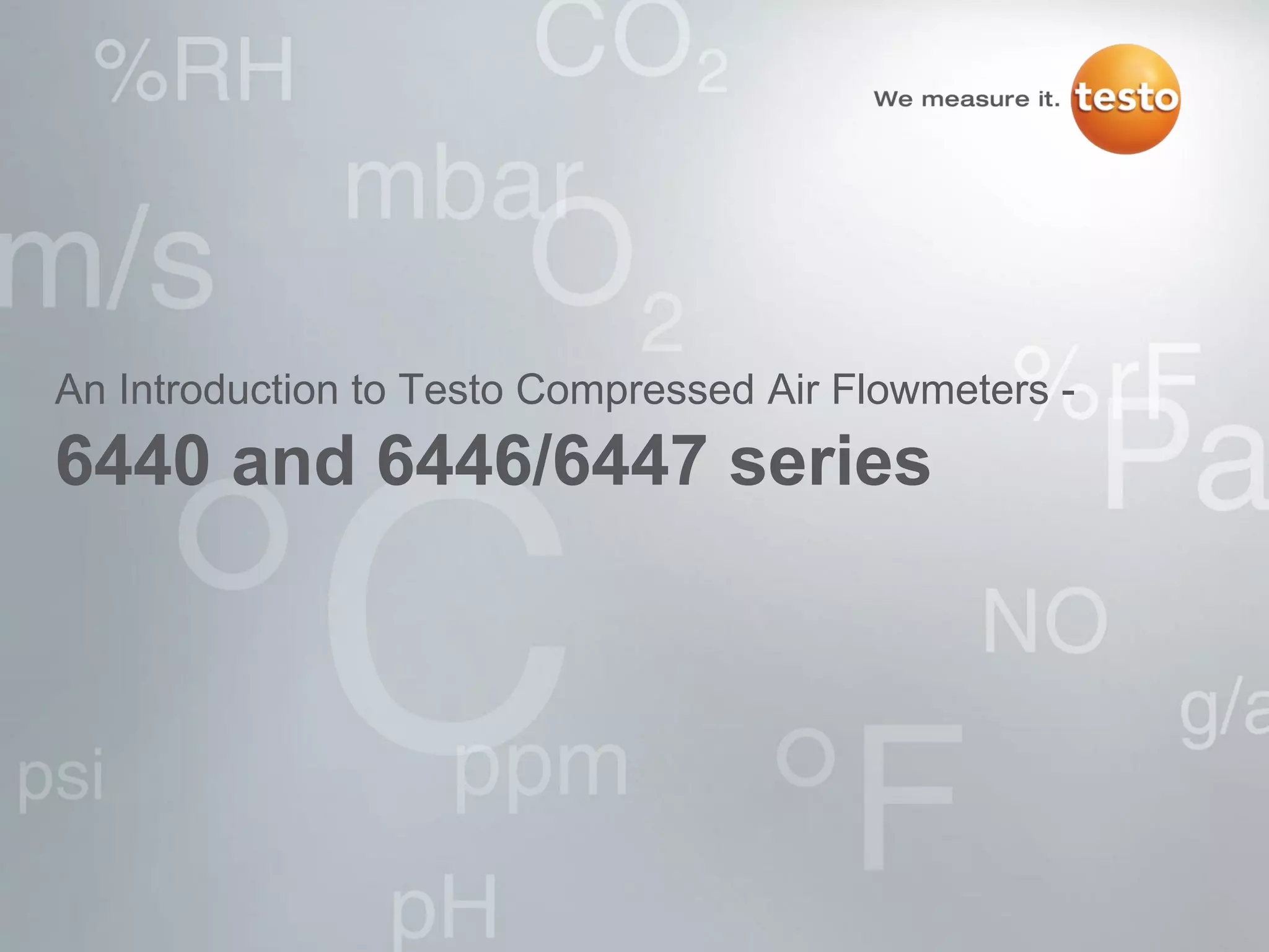 The document provides an overview of testo compressed air flowmeters (series 6440 and 6446/6447), which are devices designed to measure the flow of compressed air and other gases in industrial applications. It highlights the importance of using flowmeters for monitoring air usage, detecting leaks, and optimizing system performance, as well as outlining the key features and types of flow measurement technology used. Additionally, it notes potential applications and benefits across various industries reliant on compressed air systems.