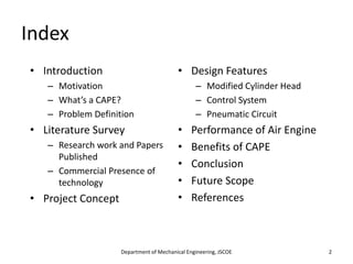The document describes a project to convert a conventional two-stroke spark ignition engine to run on compressed air. The project aims to develop a zero-pollution compressed air powered engine (CAPE) as an alternative energy solution. A literature review found previous research and commercial examples of CAPE technology. The design features of the project include modifications to the cylinder head, an electronic control system, and pneumatic circuit to control compressed air flow. Testing showed the CAPE produces power while eliminating pollution, with benefits of using only air, lower maintenance needs, and no fossil fuels. Future work may include multi-cylinder versions with improved air recirculation and higher torque.